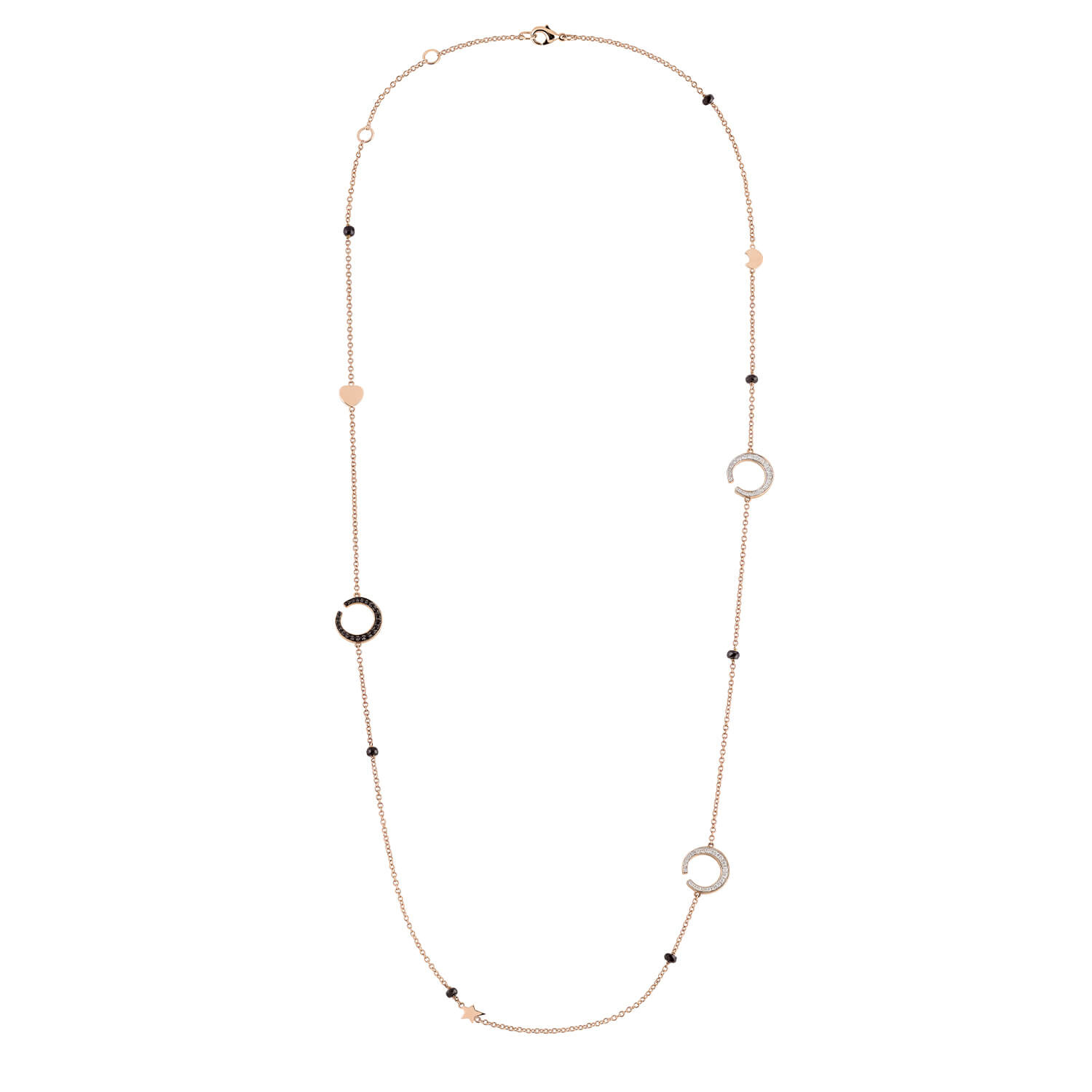 This fantastic, unique necklace is a real eye-catcher! The necklace is decorated with the recognizable half moons that can be worn in two ways. One side is set with white diamonds, the other side is set with black sapphire. incorporated. In addition to the beautiful crescent moons, the necklace is decorated with balls of black Sapphire, gold hearts and a gold star. A great combination of playful perfection!