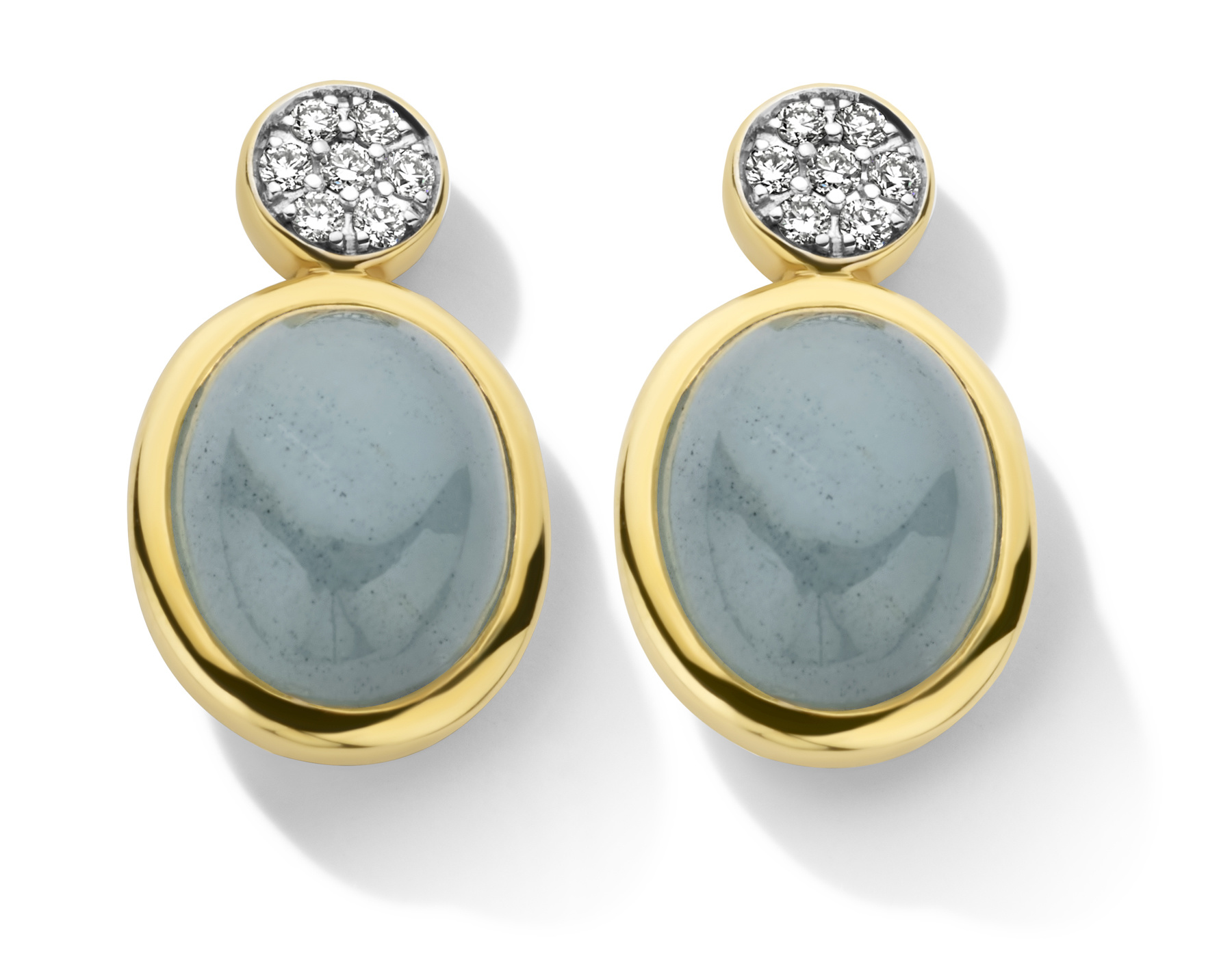 Two ornaments with different sizes that match each other perfectly. The top one is set with beautiful diamonds and falls on the earlobe. To make the diamonds shine optimally, they have been placed in a white gold setting and contain a total of 0.12ct. Below this, the Milky Aquamarine gemstone subtly stands out. The gemstone is oval cabouchon cut and set in a beautiful smooth setting. The ear studs are lightweight so the earrings fall nice and flat on the ear.