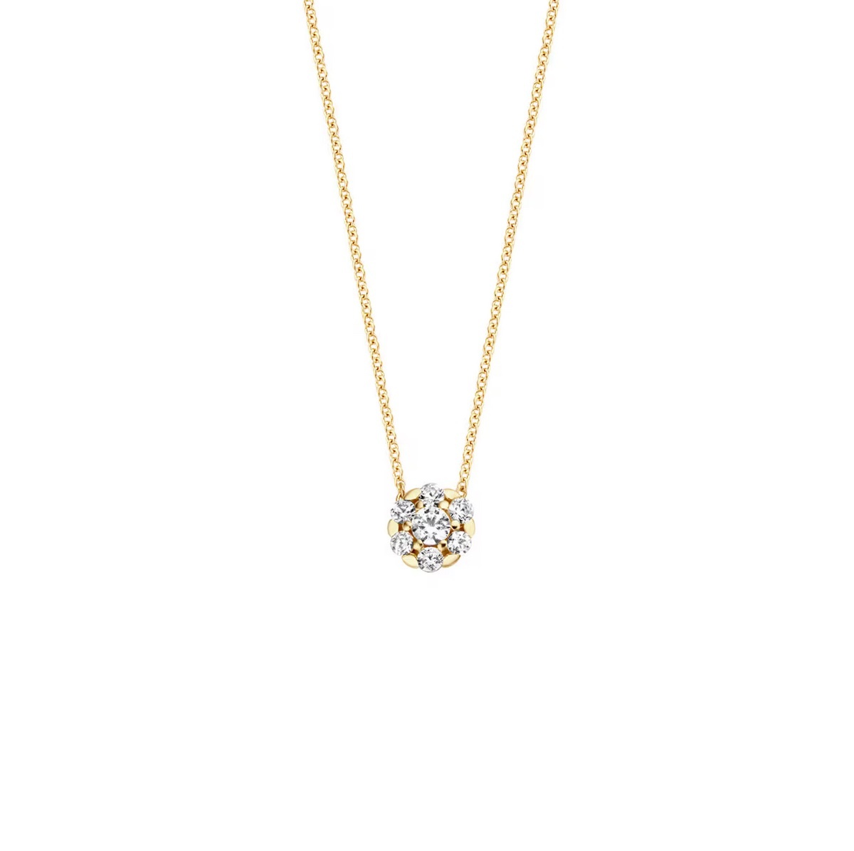 The combination of yellow gold and zirconia makes this necklace a very elegant whole. The pendant with seven diamond-cut zirconias has a diameter of 5.2 mm. Beautiful on its own, but can also be combined with other jewelry with zirconia.
