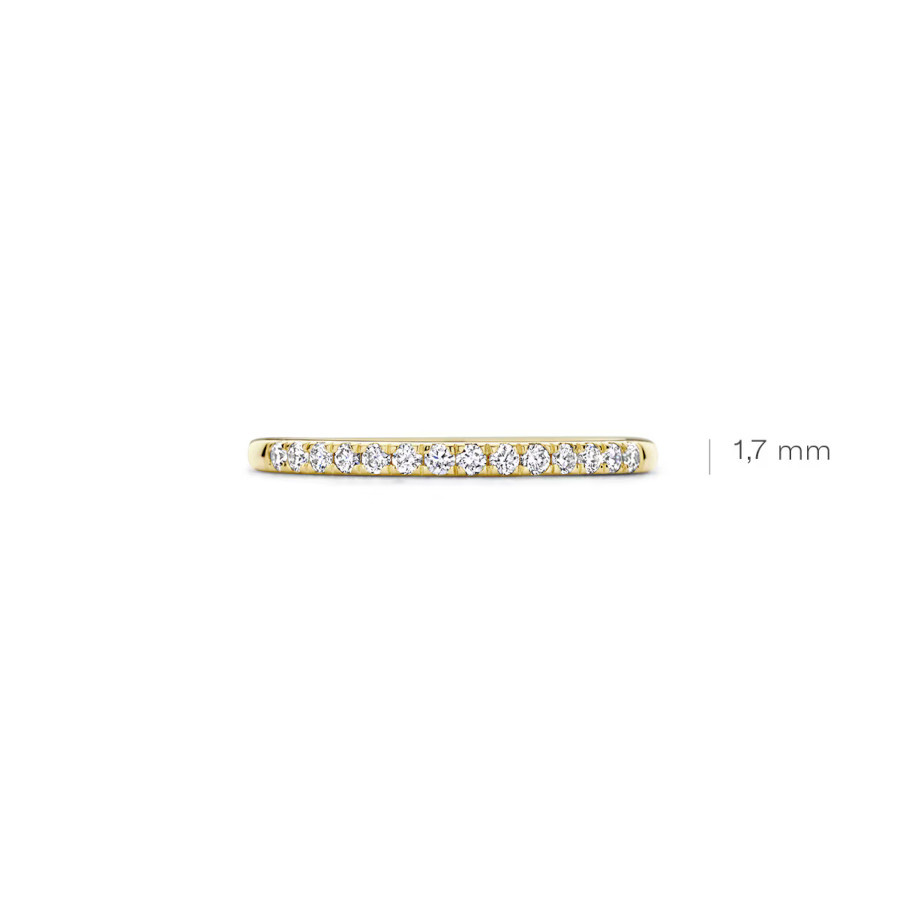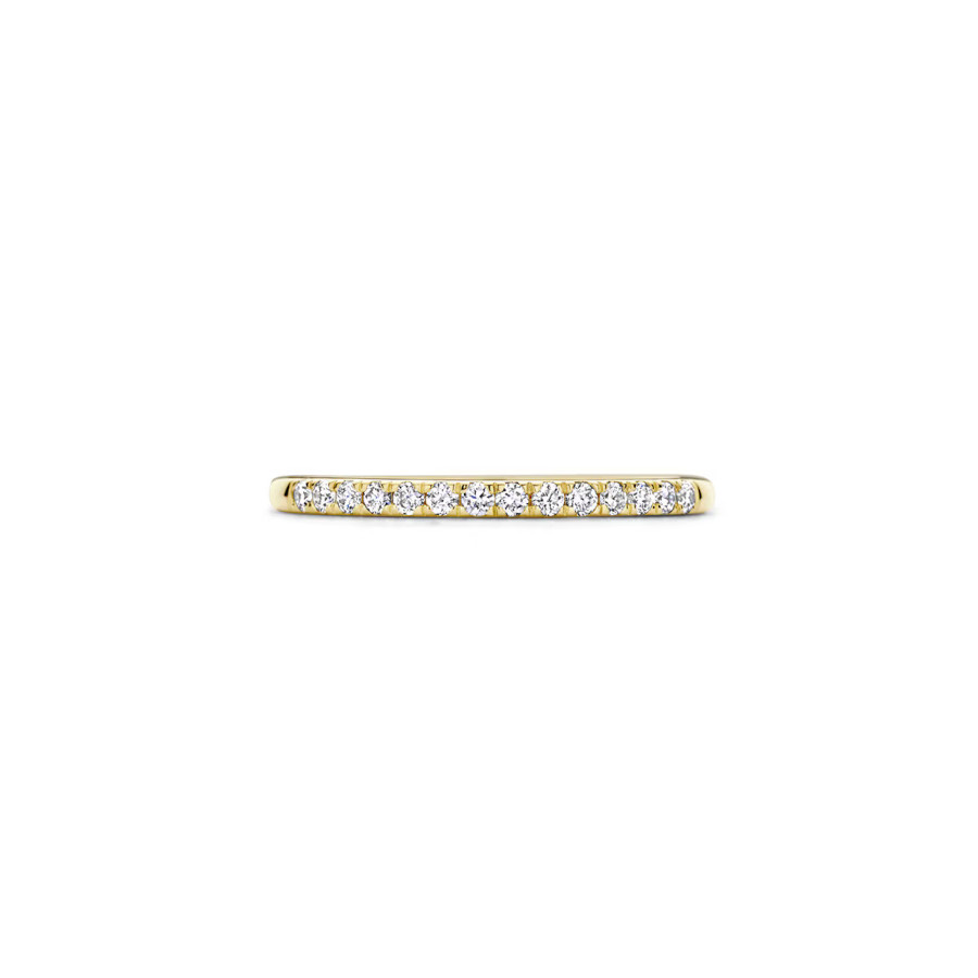 Made from certified recycled gold with lab-grown diamonds. This 14k yellow gold Lab Diamonds ring is crafted in bright polished gold and features 14 brilliant-cut lab-grown diamonds, set in a pavé setting. The total weight of the lab-grown diamonds in this ring is 0.21ct. The ring has a band width of 1.7mm and is perfect to combine with other gold jewelry. When worn solitaire, this slender ring is an elegant eye-catcher.