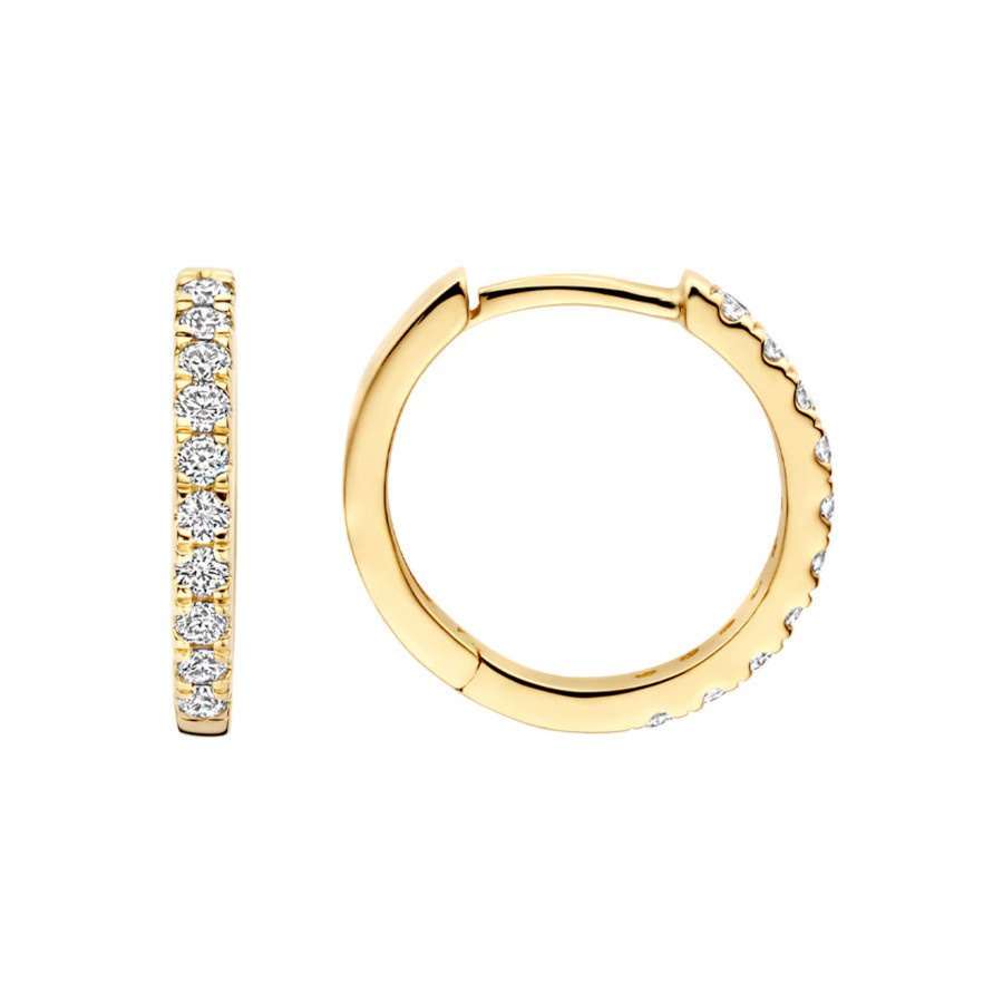 Sparkling lab diamonds in a pavé setting adorn these 14k yellow gold hoop earrings. They measure 14.2mm and feature a snap closure. The lab-grown diamonds have a carat weight of 2 x 0.165ct. The earrings are stylish on their own, but also combine beautifully with other lab diamond jewelry from our collection.