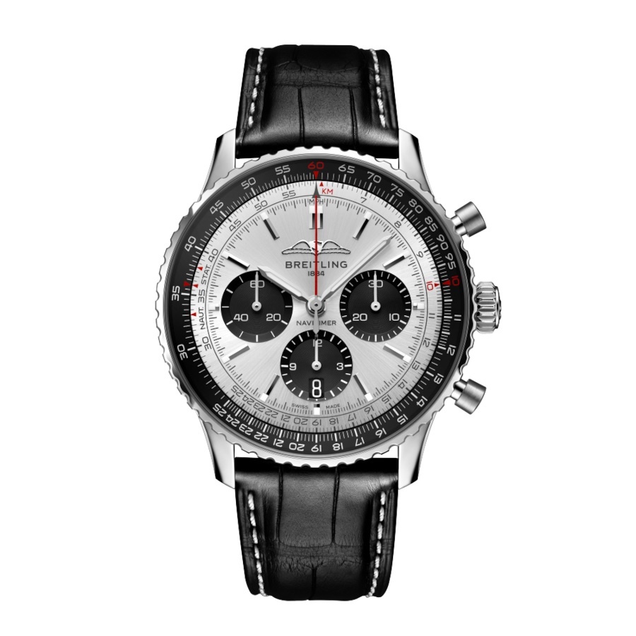 Article number: AB0138241G1P1The famous Navitimer from Breitling, equipped with a fantastic Manufacture caliber B01. This Breitling Navitimer with silver-plated dial has a case size of 43 mm and has a black leather strap with a folding clasp. The case back is fitted with sapphire glass through which the beautiful Breitling Manufacture movement can be admired.