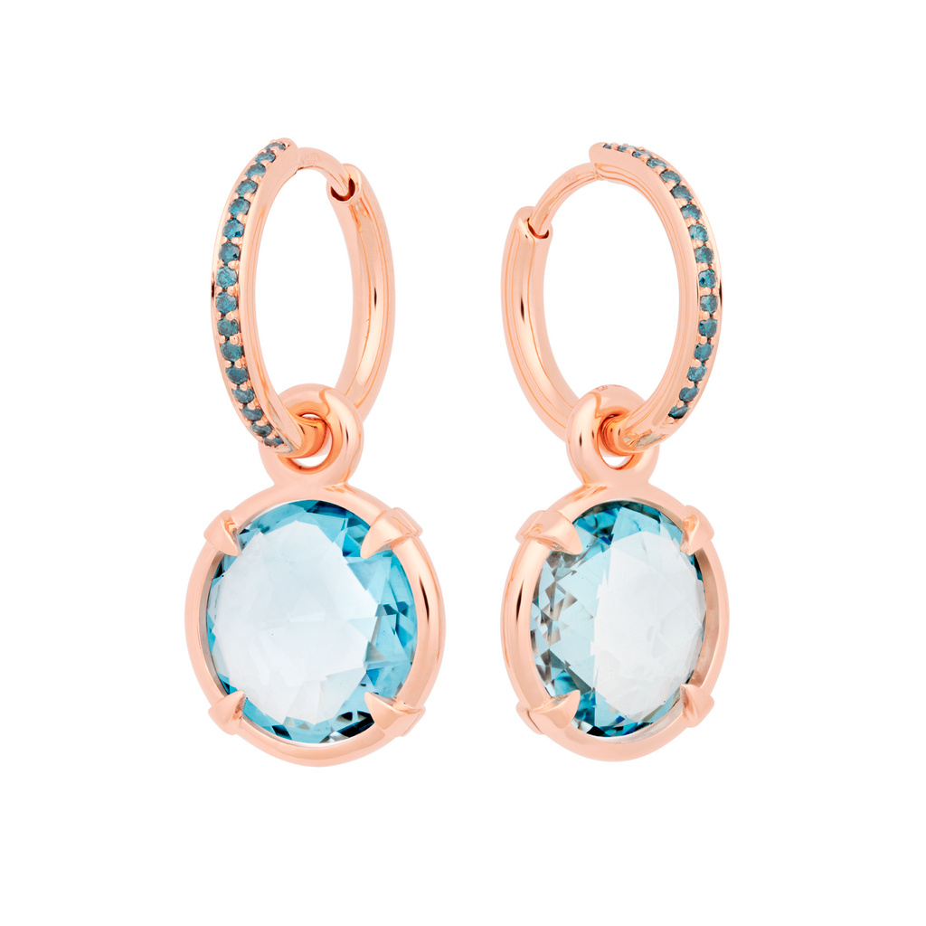 Beautiful rose gold hoop earrings with blue Topaz. The gemstone is 12mm and is facet cut. We call this cutting method briolet and it is cut in this way especially for BRON. They come into their own in the Mira Mira trailers, which provide maximum effect through their play with light. These hoop earrings are supplied without hoop earrings, and can be worn on your own hoop earrings or on one of the many Bron hoop earrings. This model is part of the 'Mira Mira' collection, which means look. Placed in an open setting, the Amethyst, Citrine, Hessonite or Topaz forms a colorful window that allows light to pass through from both sides. Mira Mira!