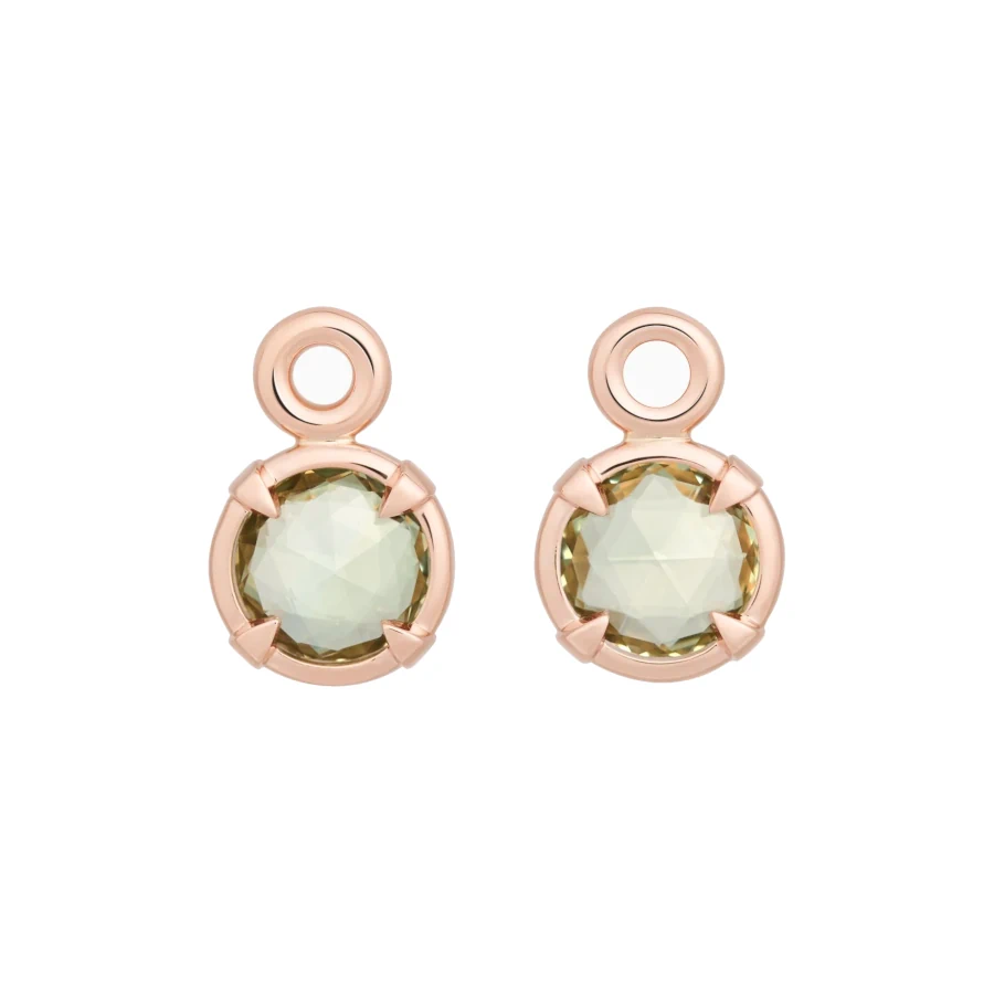 Beautiful rose gold hoop earrings with Lemon Quartz. The gemstone is 8mm and has a facet cut. We call this cut briolette and it is cut this way especially for BRON. They really stand out in the Mira Mira earrings, which play with light for maximum effect. These hoop earrings are supplied without hoops and can be worn with your own hoop earrings or with one of the many Bron hoop earrings. This model is part of the 'Mira Mira' collection, which means "look." Set in an open setting, the Moonstone creates a colorful window that lets light shine through from both sides. Mira Mira!