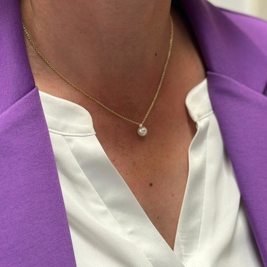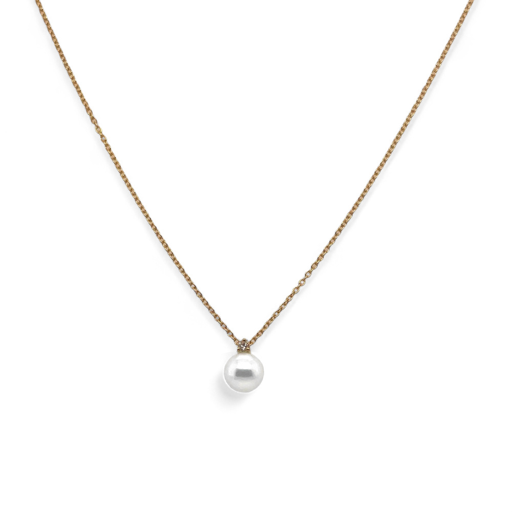 Article number: 612081This fine 18k yellow gold necklace with an Akoya pearl and 1 diamond is timeless and subtle. The pearl is beautifully soft white and round and above it is a subtle diamond of 0.03ct. The diamond has color H and clarity Si.