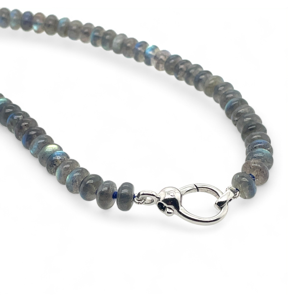 Article number: 613585This gemstone necklace made of gray Labradorite has a beautiful 18k white gold open oval decorative clasp.