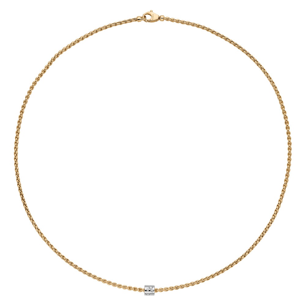 The Aria collection is FOPE's thinnest and finest collection. The refined yellow gold 2.5mm links are adorned with an elegant diamond pendant. The playful, integrated white gold pendant is sprinkled with various sizes of white diamonds with a total weight of 0.17 ct G/VSI.