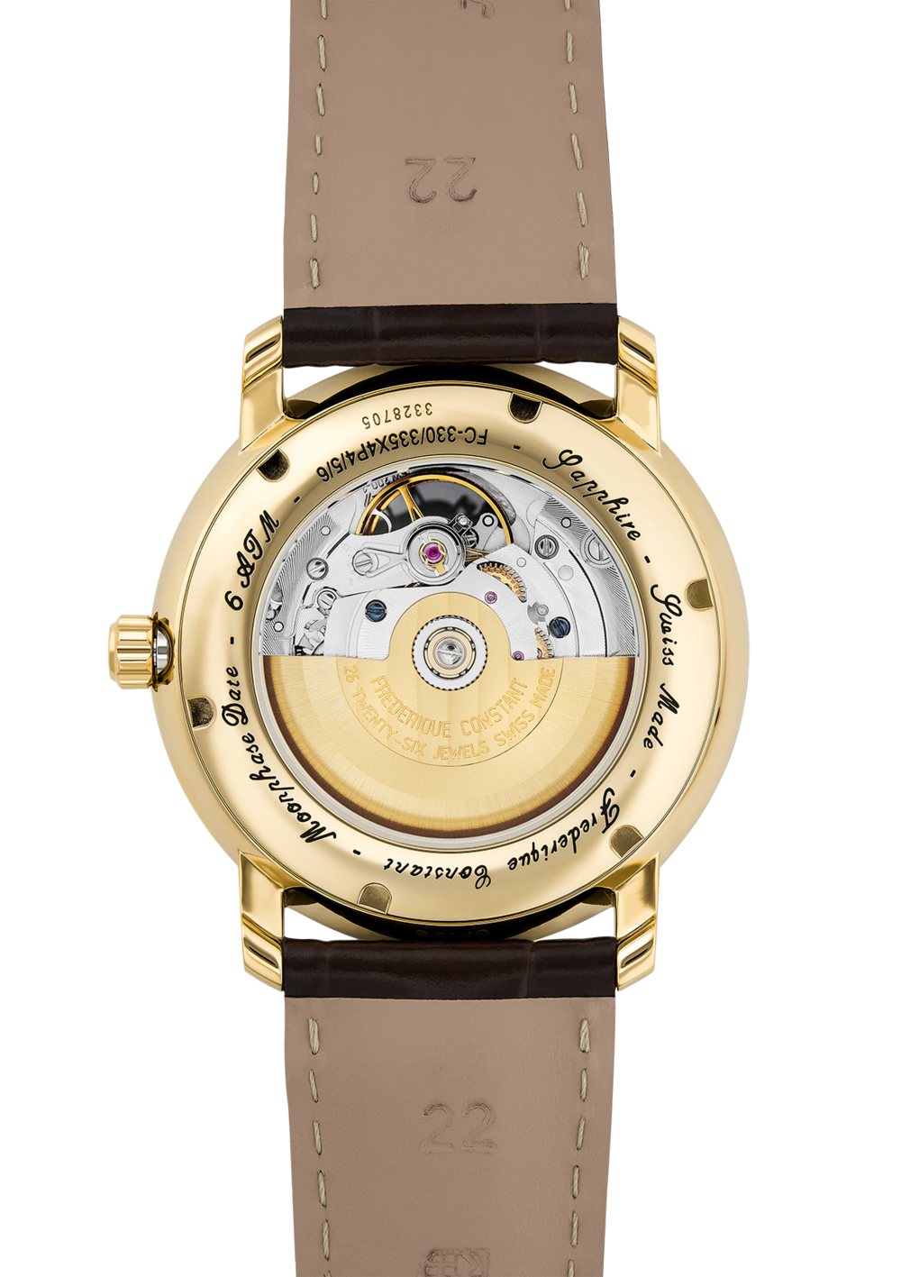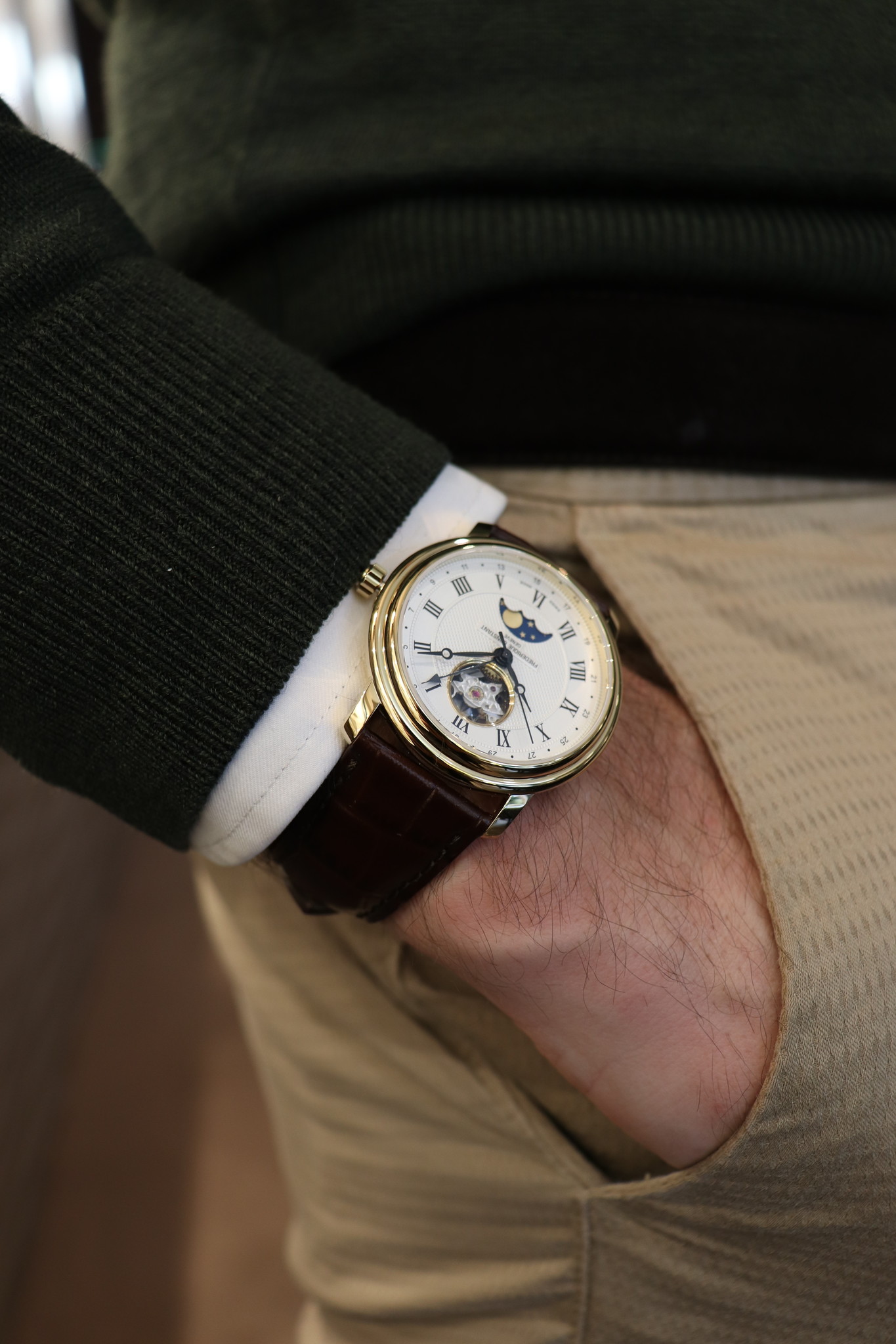 Article number: FC-335MC4P5The Classics Heartbeat men's watch has an elegant appearance, beautifully made with a scratch-resistant sapphire crystal and comes with a brown leather strap. In addition to the time, the watch displays the date and the current moon phase. Through an opening in the dial and the glass bottom, you can see the beautiful mechanical movement.