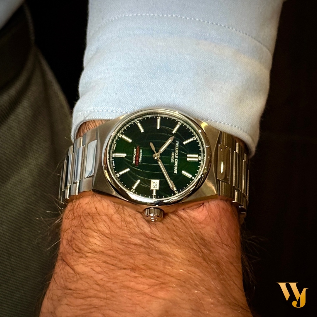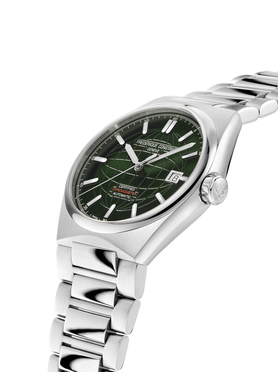 Article number: FC-303G3NH6BThe latest Frederique Constant Highlife 39mm FC-303G3NH6B, a sports dress watch with integrated steel strap and a green dial. The steel strap has a quick change system, and the watch comes with an extra rubber strap to change yourself.