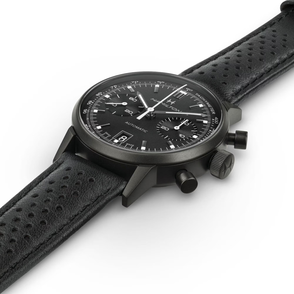 Article number: H38446730Inspired by the original 1968 racing model, the Intra-Matic Auto Chrono reinterprets the iconic Intra-Matic design. The all-black 40 mm PVD case, dial and perforated strap give a modern twist to a historic 1970s model.