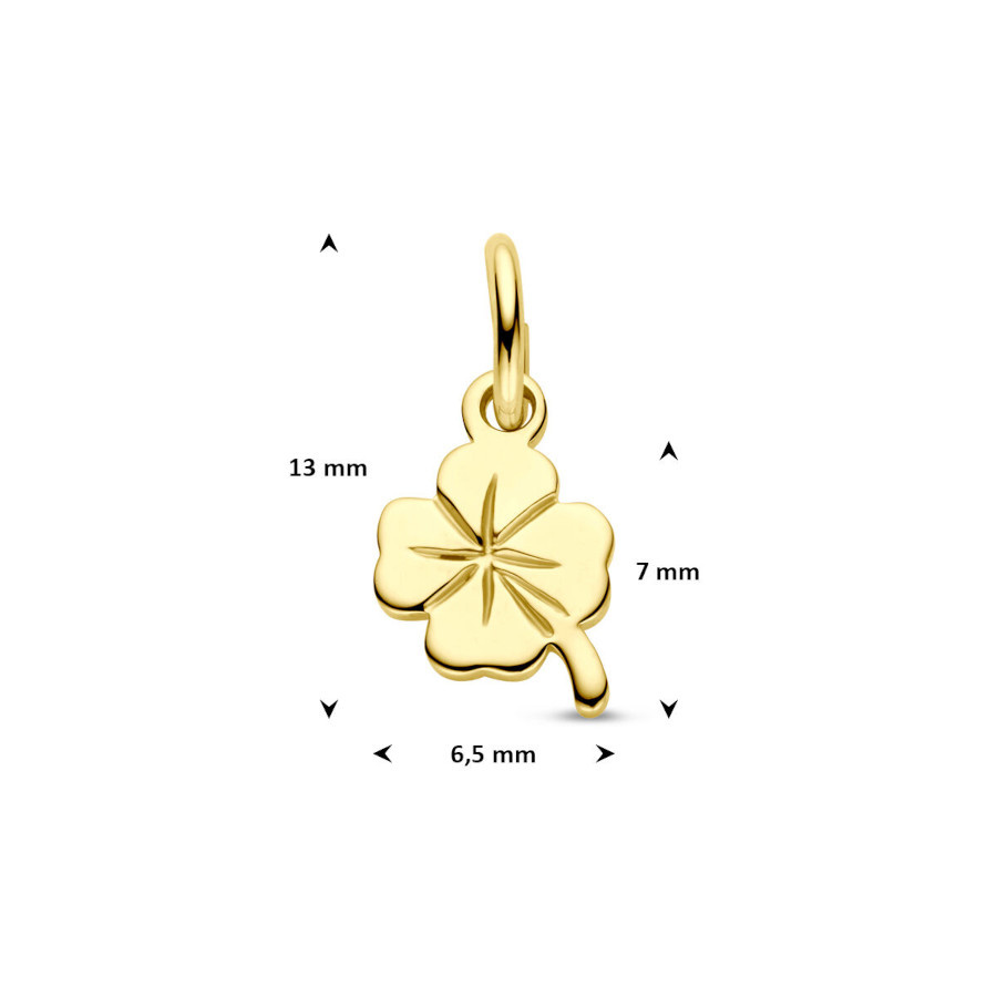 A small piece of jewelry with a profound meaning. With its refined size of 7 x 6.5mm, the piece has a subtle appearance, while the 14k yellow gold provides a luxurious and durable character. A meaningful detail that effortlessly enhances any necklace. The clover is finished with a sturdy eyelet, making it suitable for both delicate and slightly thicker necklaces. The pendant comes without a necklace and can be worn on your own necklace or on one of the many necklaces we have in stock. Perfect for everyday wear or as a gift as a lasting sign of luck, love, and protection.