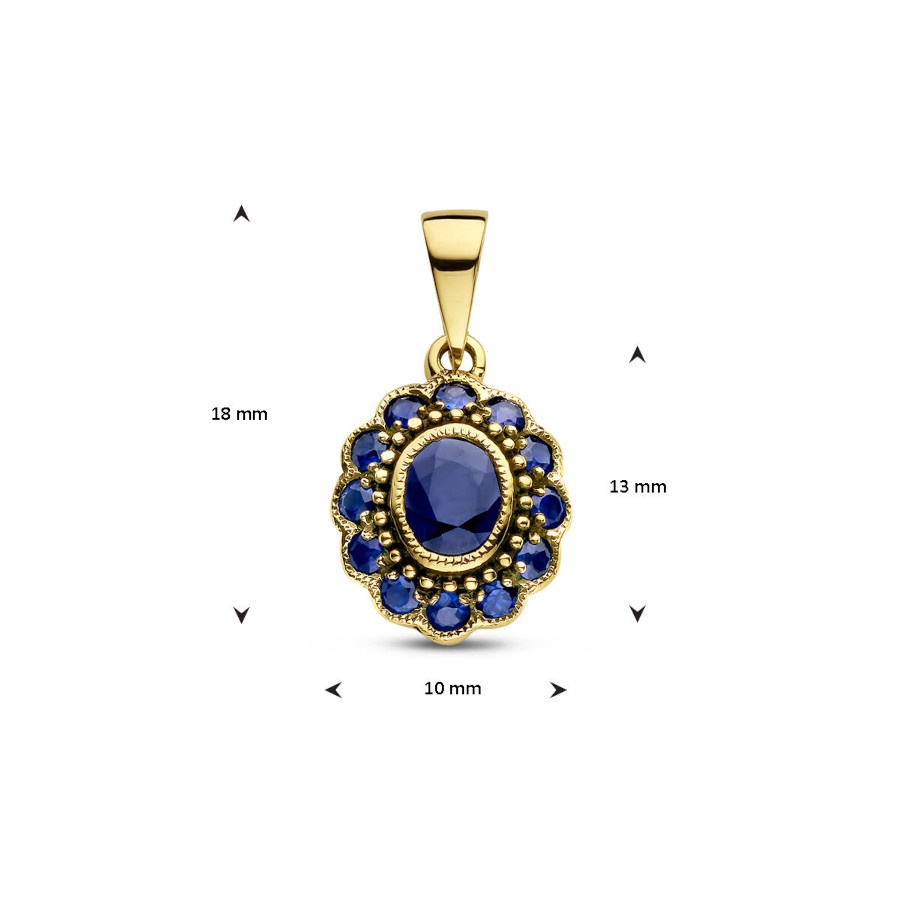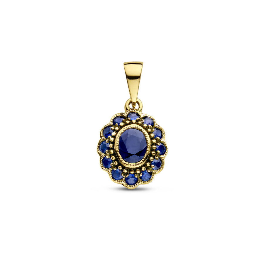 The vintage design exudes character: subtle details, sparkling accents, and a silhouette reminiscent of classic jewelry. Each element has been carefully crafted to enhance the sapphire's brilliance. The oval pendant measures 10x18mm, and the sapphires have a total weight of 0.70 ct. This pendant comes without a necklace and can be worn on your own necklace or one of the many necklaces we have in stock.