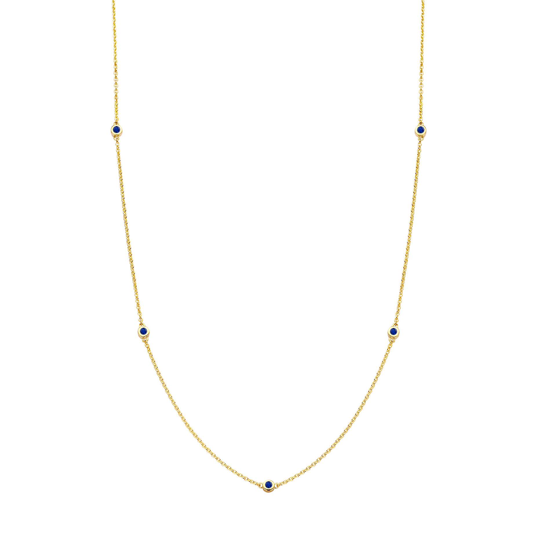 Miss Spring 14krt geelgouden ankercollier met 5 saffiertjes. De lengte van het collier is 44cm met een tussenoog op 41cm. Het collier is tevens leverbaar in 14krt rosé- en witgoud.