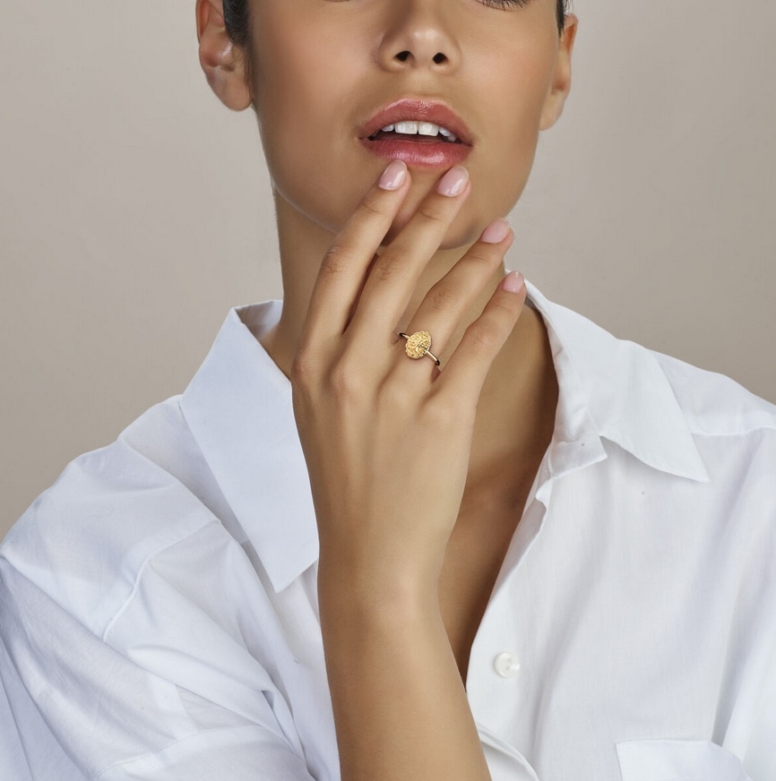A beautiful ring where the ring on top is decorated with a filigree wirework. The refined, thin gold wires together form an elegant motif and get a classic and vintage look due to the oval shape. This ring is fantastic to wear on your pinky, ring, middle, or index finger.