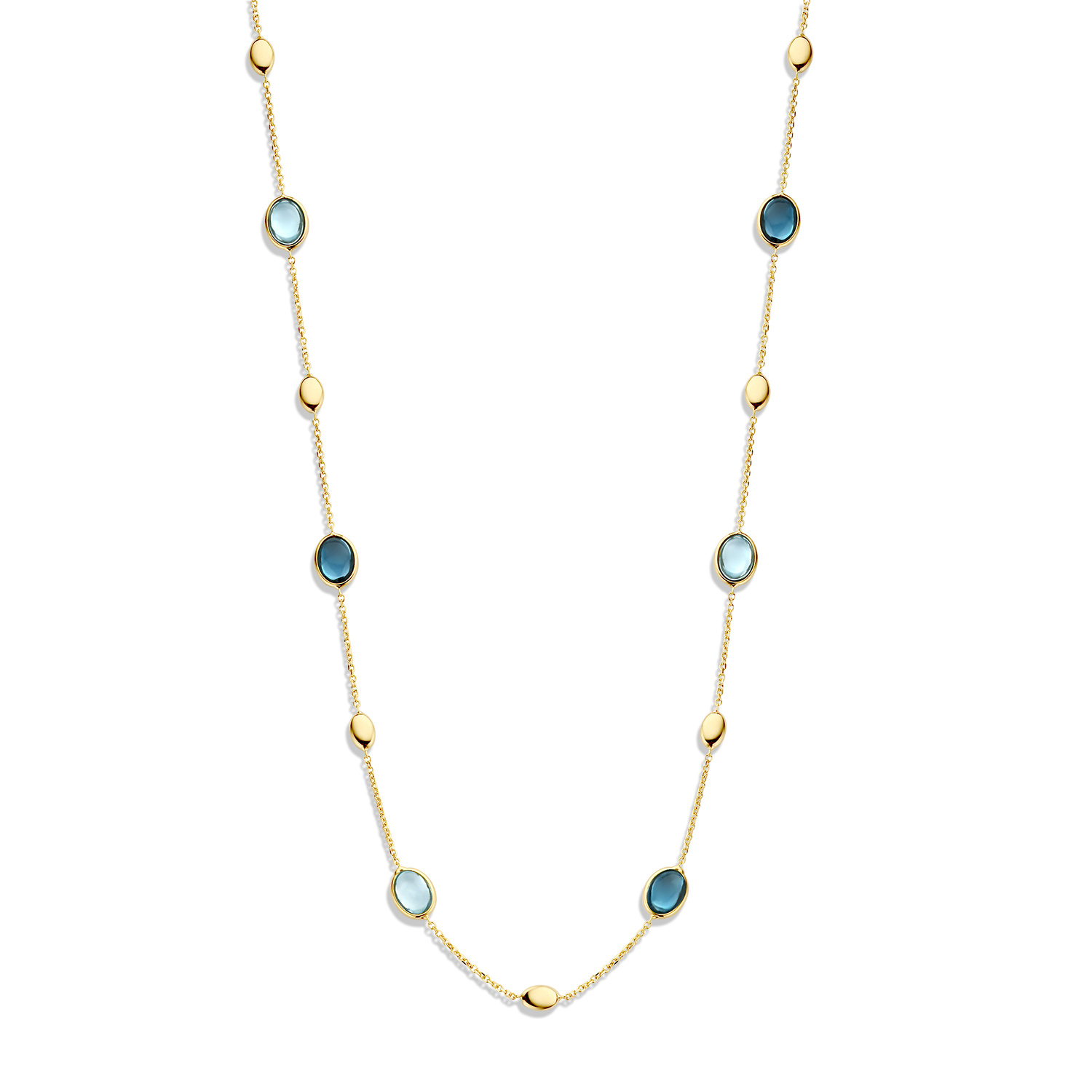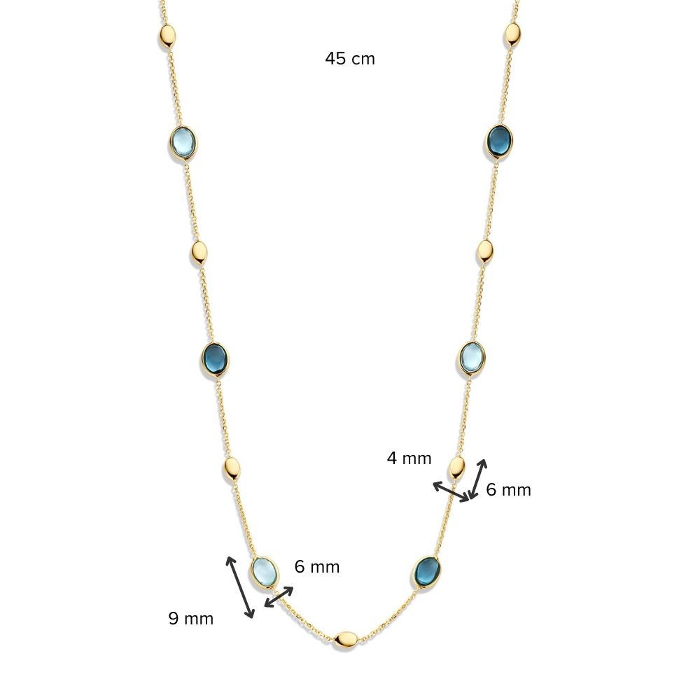 The beautiful oval gemstones London Blue Topaz and blue Topaz alternate in this beautiful necklace and are combined with round yellow gold ornaments. The necklace has a length of 45cm.