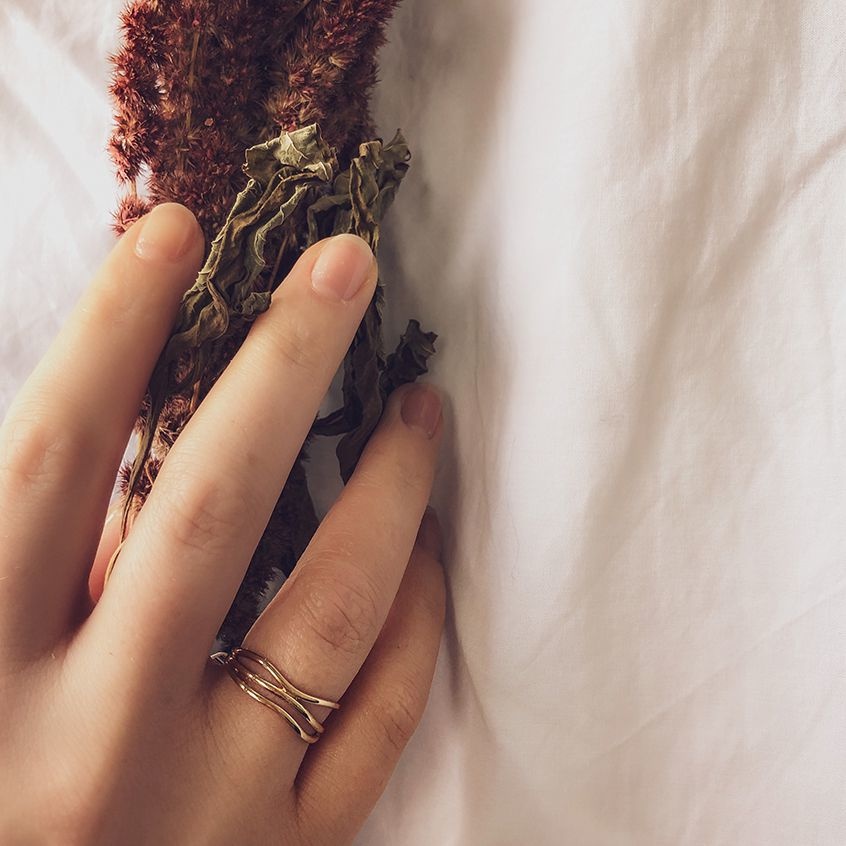 Three refined courses that playfully run next to each other in different ways. The openwork ring has a subtle width of 6mm but looks airy because the three strips have a thin, graceful shape.