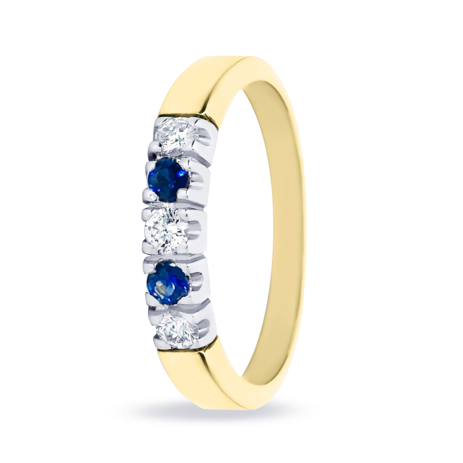 Article number: RIN1705-3PW-2BLSAThis classic gold alliance ring is set with 3 diamonds and 2 blue sapphires in a white gold setting. The ring has a sleek design with a flat side and a slightly convex top.