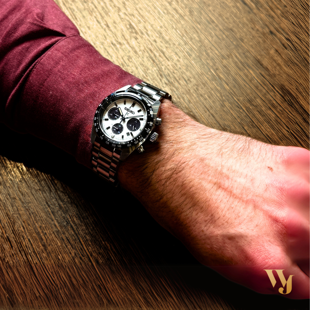 This Seiko Prospex Speedtimer Solar has a 39mm steel case with a white 'panda' dial. It has a solar timepiece, sapphire crystal, date display and is 100m water resistant.