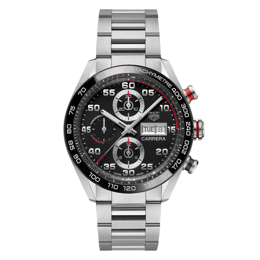 The ultimate motorsport chronograph, a must in every watch collection, the Tag Heuer Carrera with deep blue dial, clear stopwatch with red accents. In this caliber 16 version, sporty with day-date display and solid steel strap. The timepiece has a 48-hour power reserve.