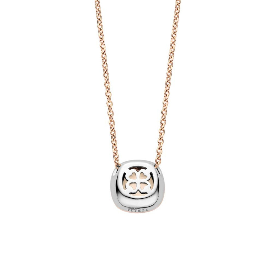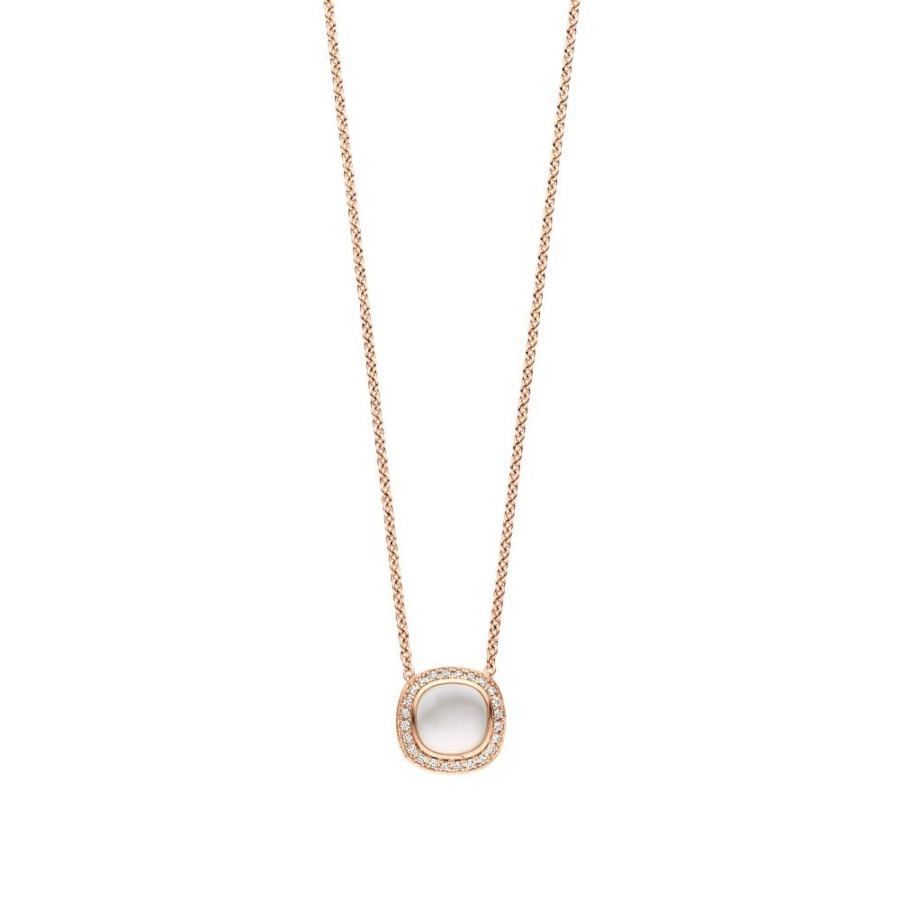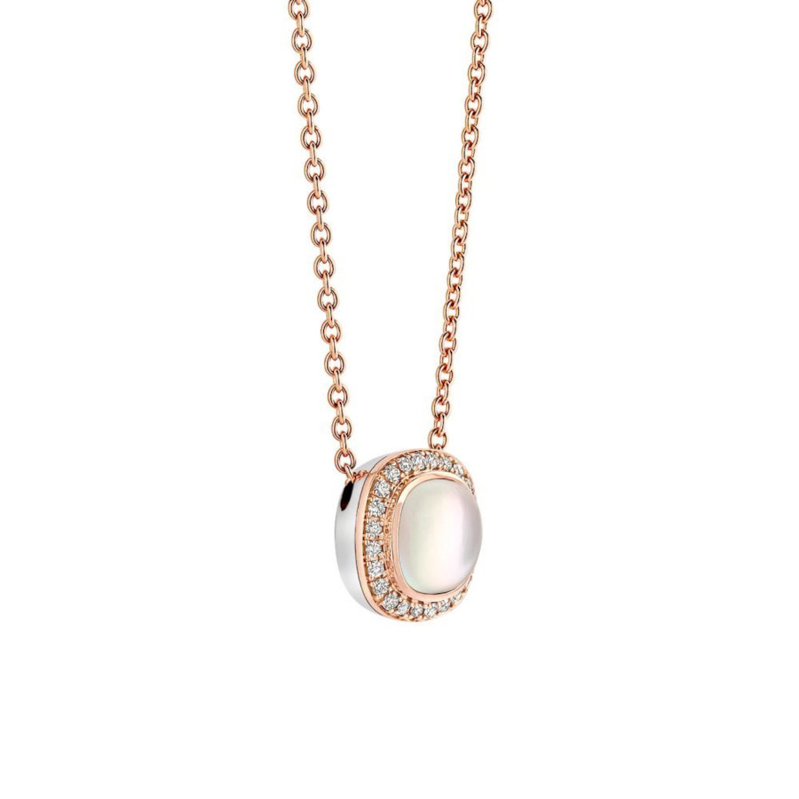 This 18k rose gold necklace features subtle anchor links that hold each other securely. The chain features a beautiful silver and rose gold pendant and is adorned with mother-of-pearl and diamonds. The doublet gemstone is constructed in two layers – mother-of-pearl and rock crystal. This combination gives the stone a beautiful, unique color with a vibrant sparkle. The stone is securely held by an 18k rose gold setting and is surrounded by a cluster of white diamonds for added sparkle. A total of 0.12 ct. of diamonds is set in the necklace. The chain has a total length of 45 cm but the distance between the rings is 41 and 43 cm.