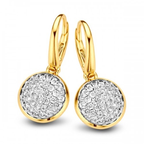 These yellow gold earrings with pastilles set with diamonds are slightly convex and beautiful. To make the diamonds shine optimally, they are placed in a white gold setting and a total of 0.65ct is incorporated into these earrings.
