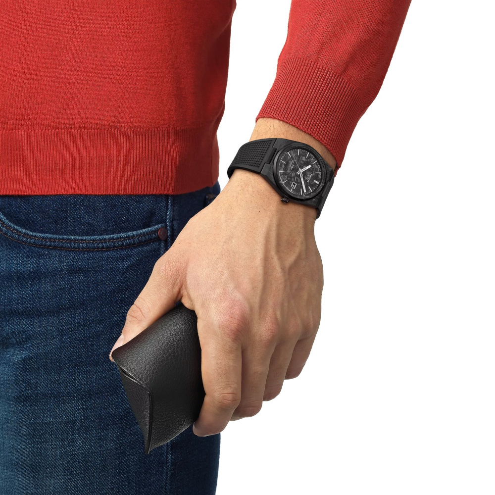 The Tissot PRX Carbon T137.907.97.201.00 combines modern design with Swiss precision. This stylish watch has a black rubber strap and a black Forged Carbon dial, which gives it a sporty look. The automatic movement ensures reliable performance and a long power reserve of 80 hours. Thanks to the scratch-resistant sapphire crystal, the watch will continue to look like new. The Tissot PRX is perfect for those who want to combine quality, craftsmanship and style in one timeless accessory.