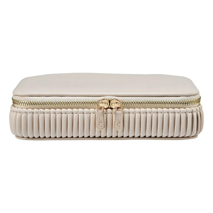 The Bella Jewelry Zip Case exudes luxury and refinement with its smooth, vegan exterior, perfectly pleated sides, and gold-tone details. Inside, you'll find three LusterLoc™-lined compartments for your jewelry, two ring holders for rings or earrings, and two additional elastic storage pockets in the lid. Simply beautiful.