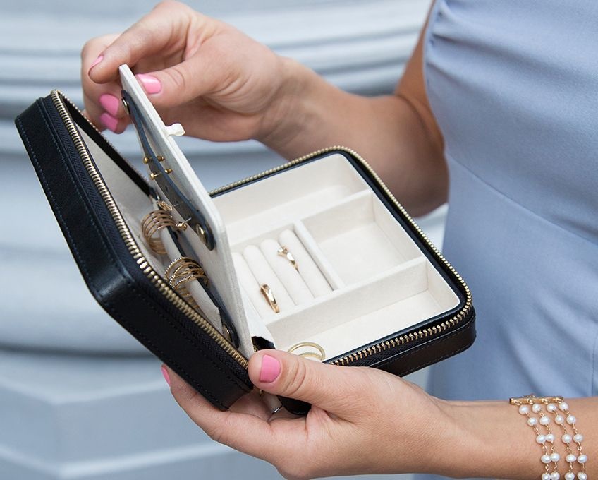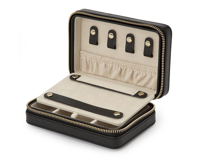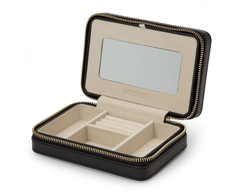 Article number: 213602A luxurious small travel and storage case for jewelry. It features a patented inner layer that significantly reduces oxidation after up to 30 years of storage.