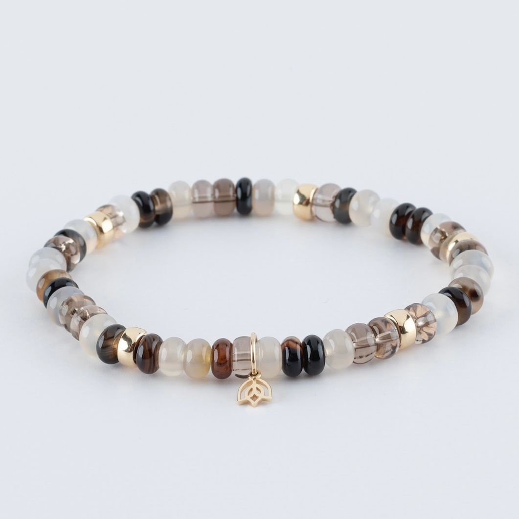 This beautiful bracelet is a combination of Smoky Quartz, Tea Quartz, White Agate and yellow gold ornaments.
