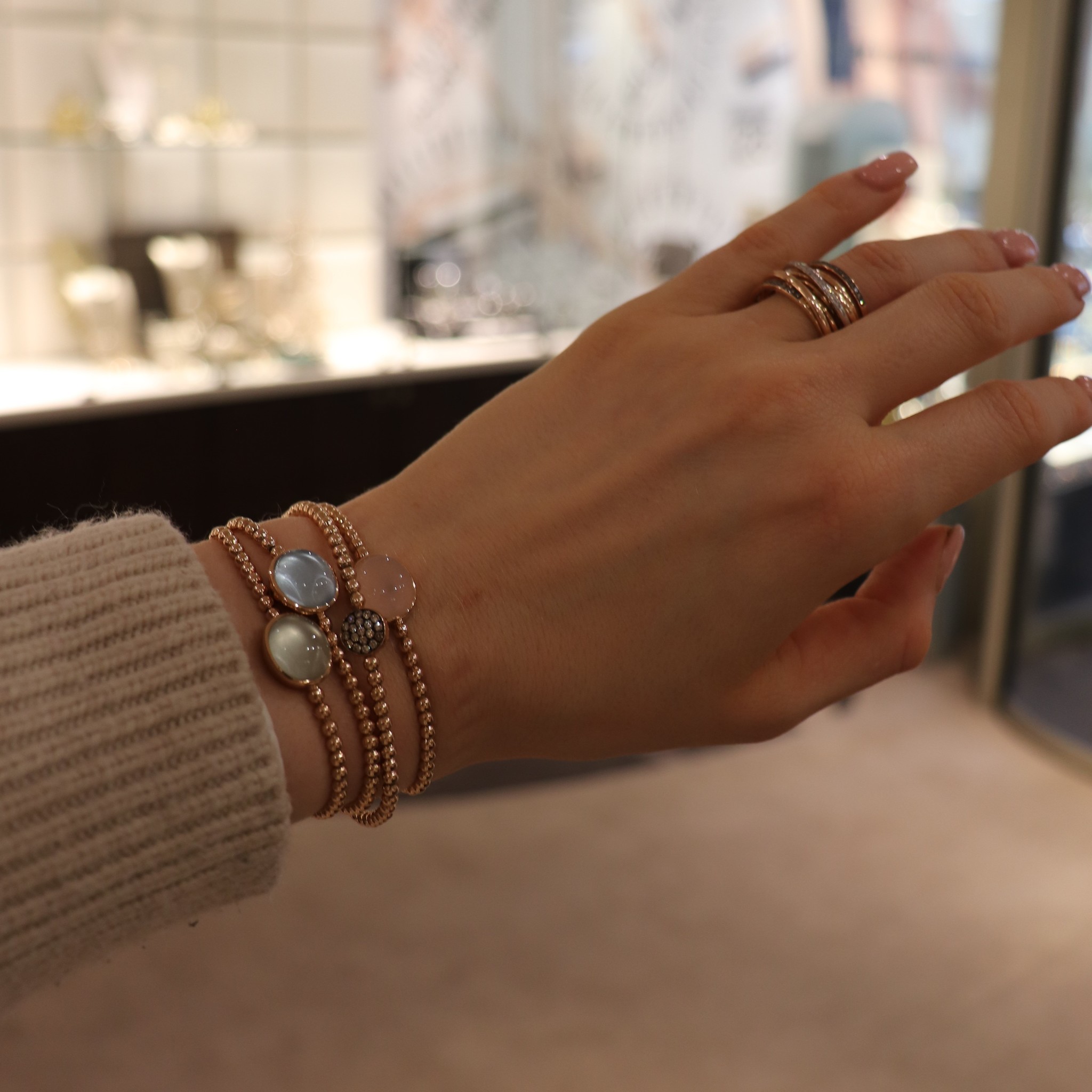 Een prachtige roségouden armband die oneindig met elkaar verbonden is, de armband heeft namelijk geen sluiting en is daardoor rekbaar. De subtiele elementen hebben een mooie ronde vorm en worden versierd door een fantastische roze Chalcedoon. De zachtroze edelsteen is ovaal van vorm en cabouchon geslepen. Fantastisch om solitair te dragen maar perfect om te combineren met andere armbanden.