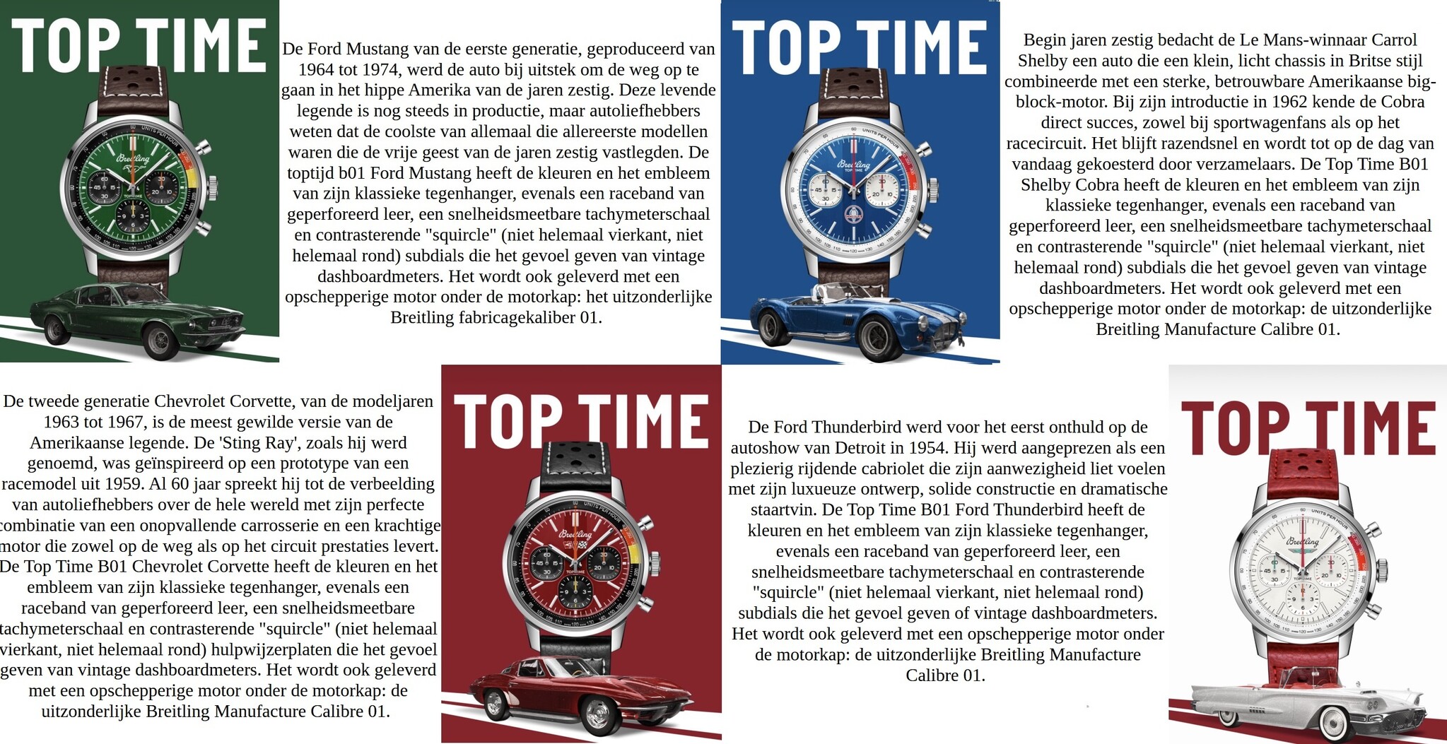 Deze Top Time Classic Car-reeks keert terug naar de oorsprong van de jaren '60 met een toewijding aan de populairste muscle cars van die tijd: de Ford Mustang en de Thunderbird, de Shelby Cobra en de Chevrolet Corvette, allemaal vertegenwoordigd in kleur en styling. Na het succes van de eerste Classic Cars Capsule-collectie, uitgebracht in 2021, zijn deze co-branded horloges opgenomen in de kerncollectie - nu met Breitlings uitzonderlijke Manufactuurkaliber 01 onder de kap.