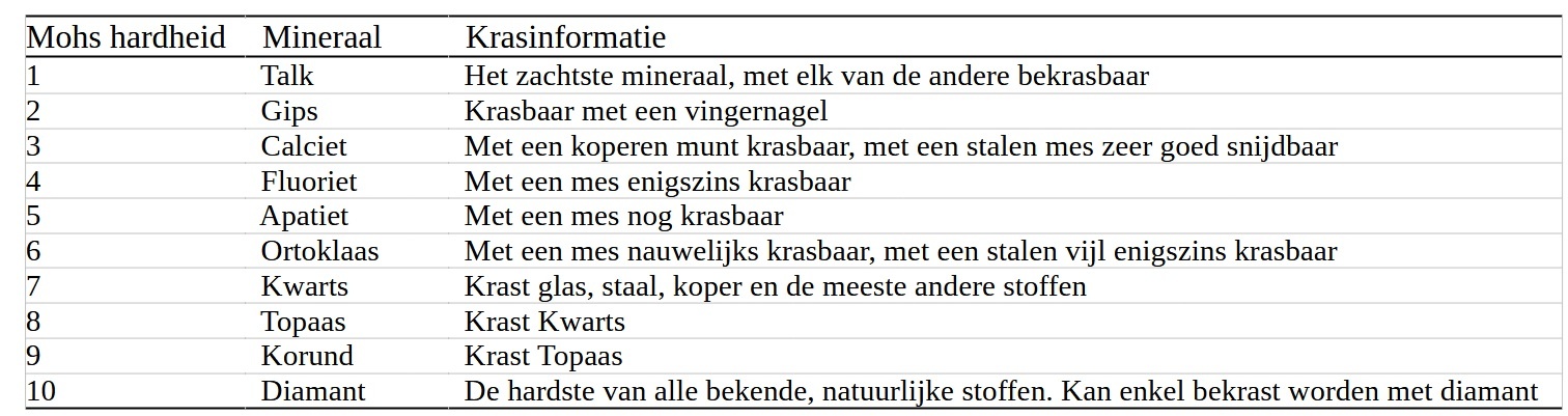 De schaal werd in 1812 ontwikkeld door Friedrich Mohs. De hardheid valt te bepalen door te zien welke mineraal de andere een kras kan toebrengen. De hoogste waarde is 10, die wordt toegekend aan diamant. Met diamant kan iedere andere mineraal bekrast worden.