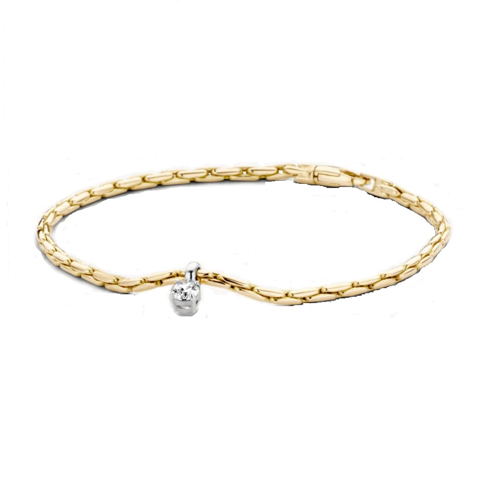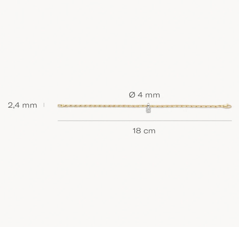 Deze armband heeft een bijzondere uitstraling door de combinatie van gepolijste 14k geelgouden schakels en de witgouden chaton-zetting met een briljant geslepen zirkonia. De armband heeft een lengte van 18 cm en de bedel een doorsnede van 4 mm.