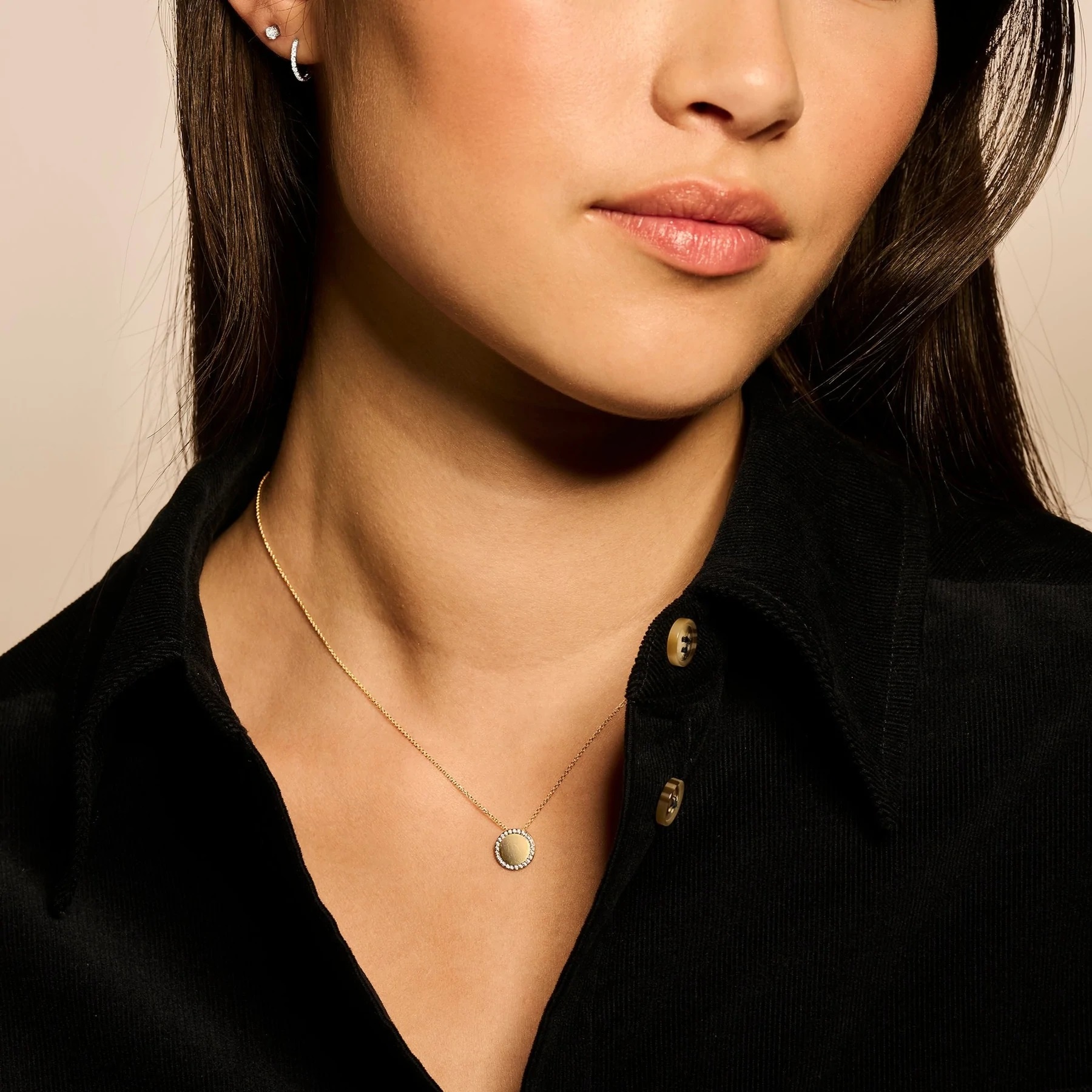 De hanger van dit 14k geelgouden collier heeft een medaillonvorm gesierd door een rand van briljant geslepen zirkonia’s. Het oogje van de hanger is aan de achterkant verwerkt wat bijdraagt aan de elegantie van het collier. Prachtig alleen te dragen of samen met andere sieraden uit onze collectie.