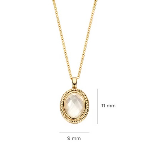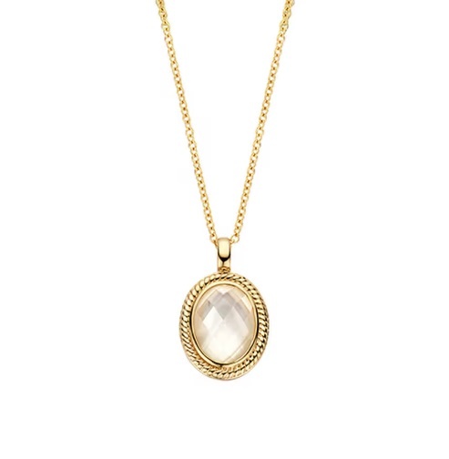 Dit collier combineert een 14k geelgouden schakelketting met een hanger van parelmoer en bergkristal. De elegante hanger met koordmotief is 11 bij 9 mm. Stijlvol op zichzelf of in combinatie met andere sieraden uit onze collectie.