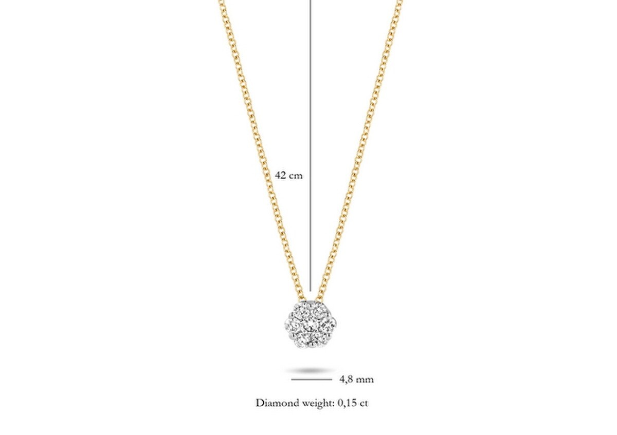 Artikelnummer: 3603BDISprankelende diamantjes met een karaatgewicht van 0,15 sieren dit elegante collier van 14k geel- en witgoud met een lengte van 42 cm. Het collier is stijlvol op zichzelf of in combinatie met andere witgouden sieraden uit onze collectie.