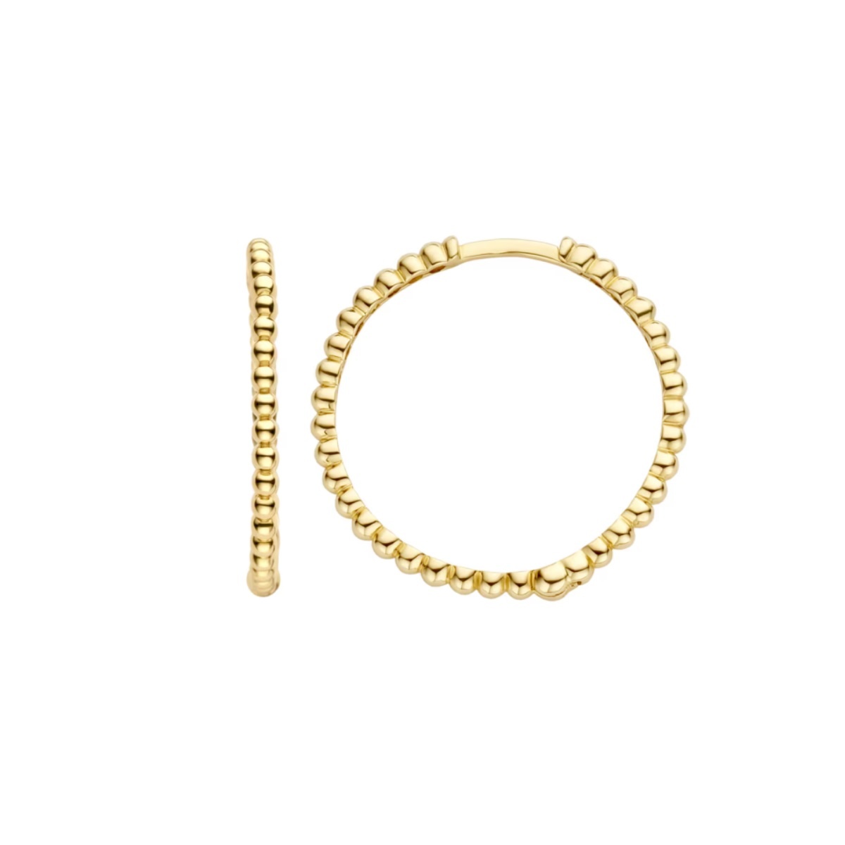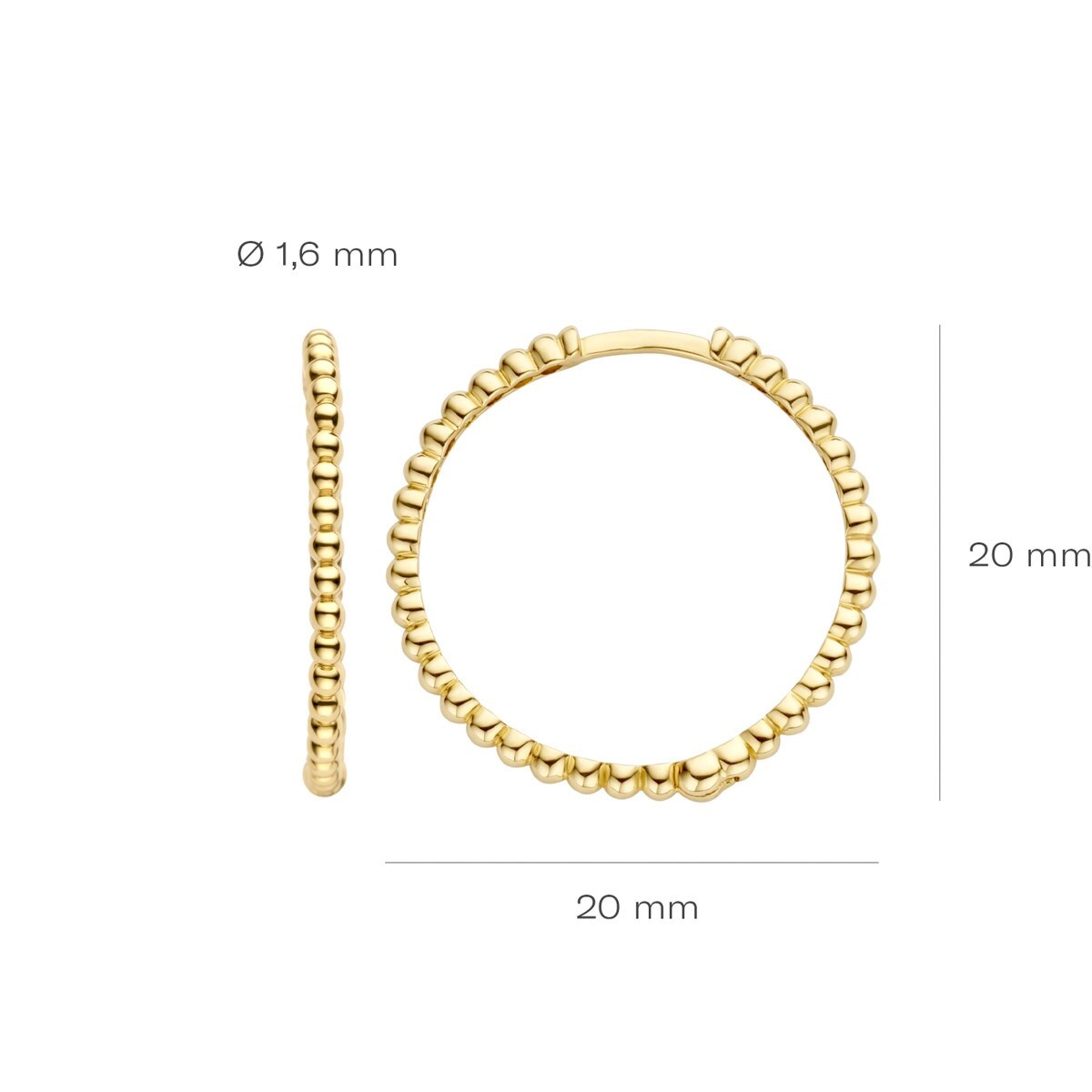 Het bolletjespatroon geeft deze 14k geelgouden ronde oorringen een speelse uitstraling. De doorsnede ervan is 20mm. Deze oorringen staan prachtig op zichzelf, maar matchen ook mooi met andere (oor)sieraden uit onze collectie.