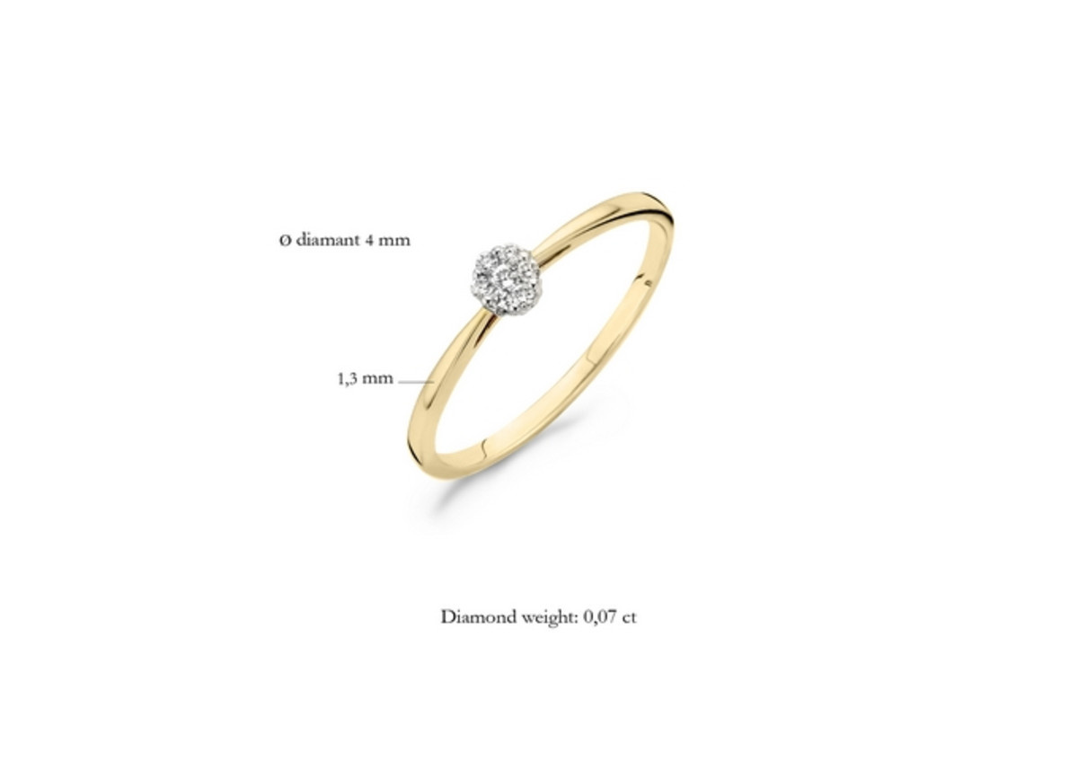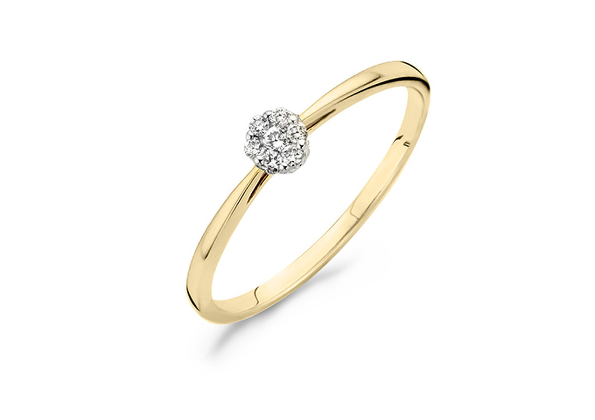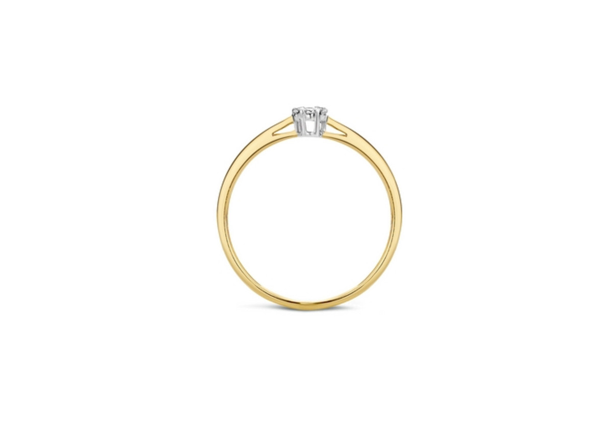 Deze elegante 14k geelgouden ring wordt gesierd door sprankelende diamanten in illusiezetting. De band heeft een doorsnee van 1,3 mm en de diamant een totaal karaatgewicht van 0.07ct. Om de diamanten optimaal te laten schitteren zijn zij in een witgouden zetting geplaatst. De ring is prachtig te combineren met andere (diamanten) aanschuifringen uit onze collectie.