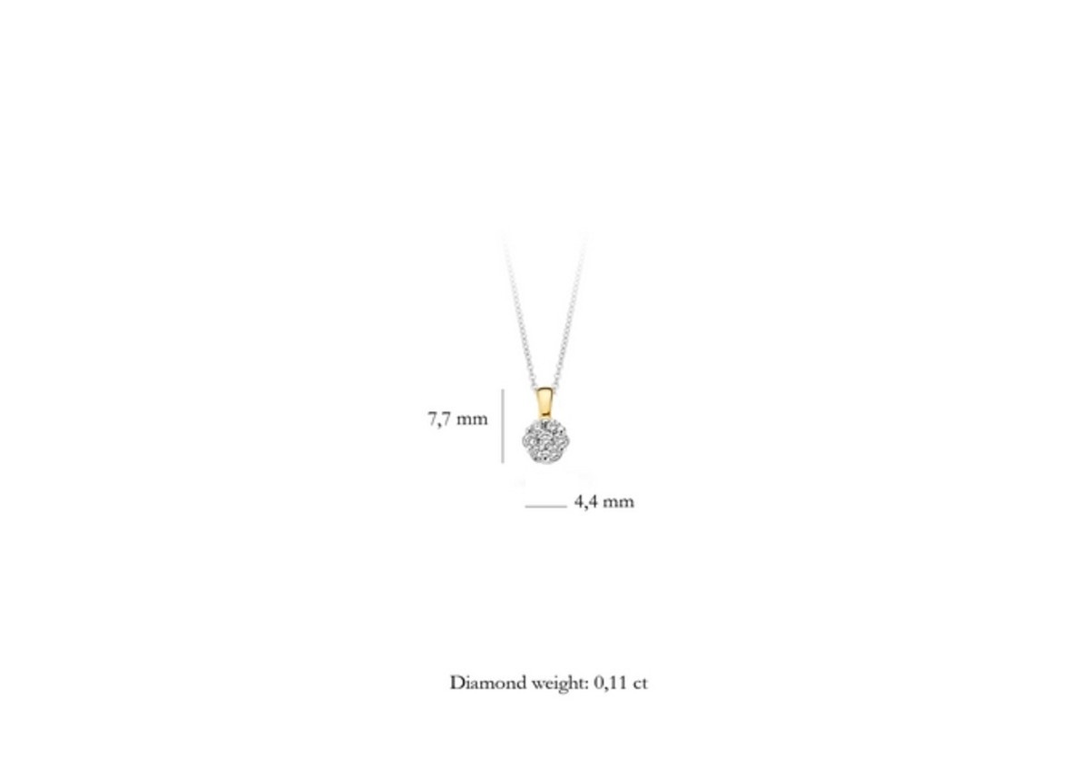 In deze hanger van 14k geel- en witgoud sprankelen briljant geslepen diamanten in een illusiezetting. De doorsnee van de hanger is 4,4 mm en de diamanten hebben een karaatgewicht van 0.11ct. Prachtig als eyecatcher op zichzelf of samen met andere gouden sieraden uit onze collectie.