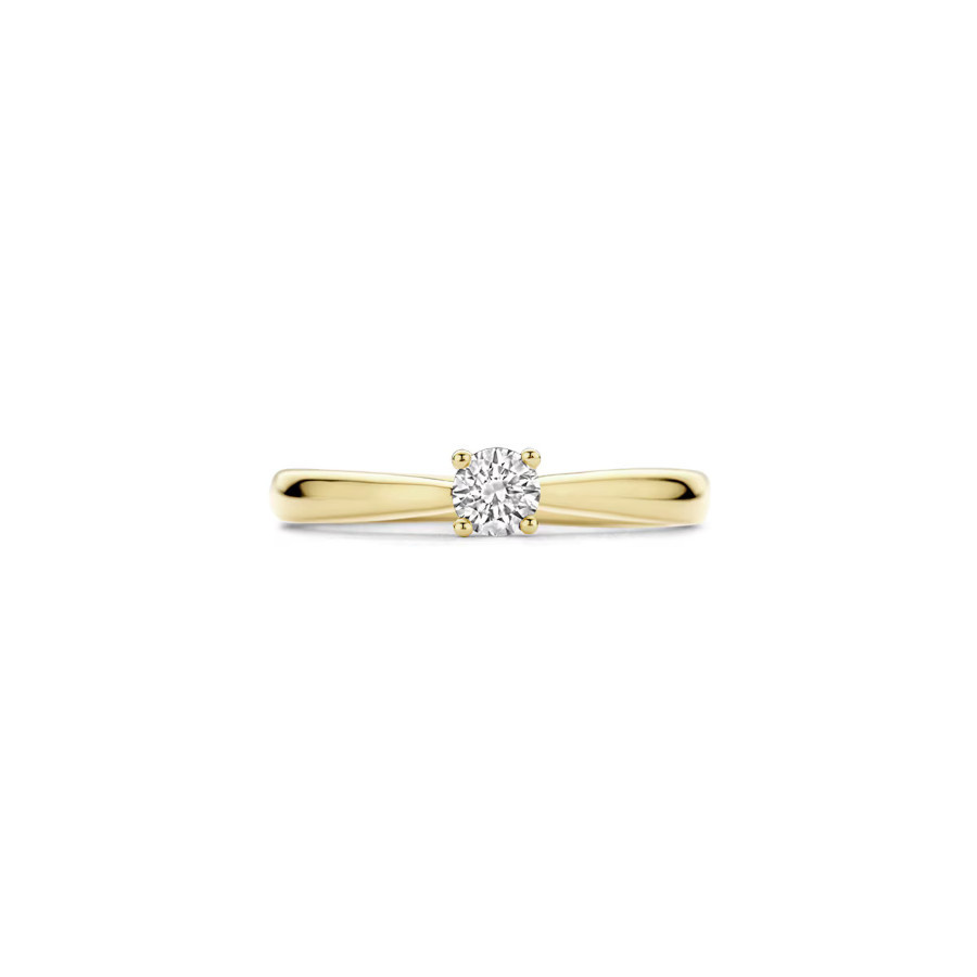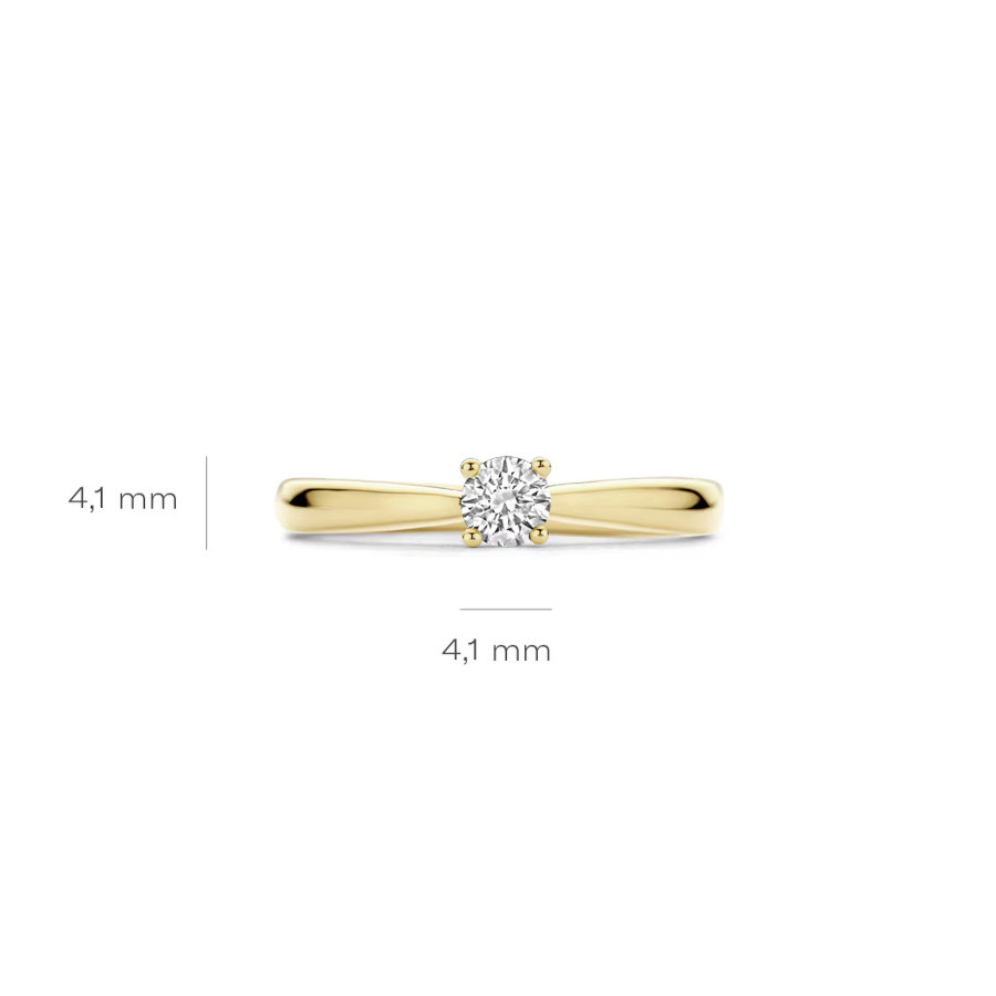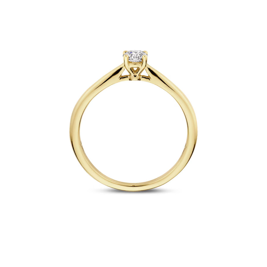 Gemaakt van 14k gecertificeerd gerecycled goud met lab grown diamant. Deze 14k geelgouden Lab Diamonds ring is uitgevoerd in glanzend gepolijst geelgoud en voorzien van een briljant geslepen Lab grown Diamant met een gewicht van 0.25ct. met een diameter van 4.1mm. Wanneer je de ring op zichzelf draagt, geeft de ring een elegante en vrouwelijke uitstraling.