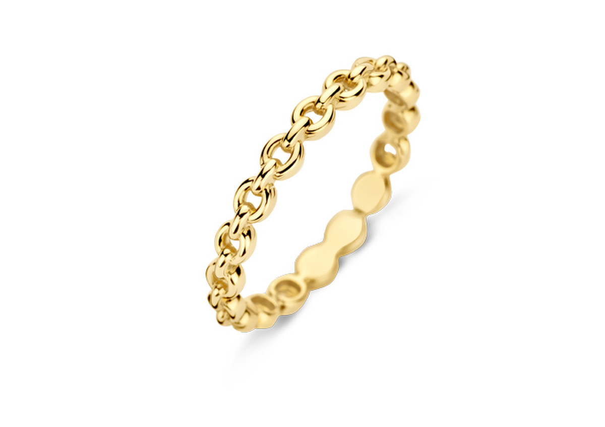 Het design van in elkaar grijpende ringetjes geeft deze 14k geelgouden ring een speelse uitstraling. De band heeft een doorsnede van 2,7 mm en de ring is prachtig op zichzelf of in combinatie met een of meer andere (aanschuif)ringen uit onze collectie.