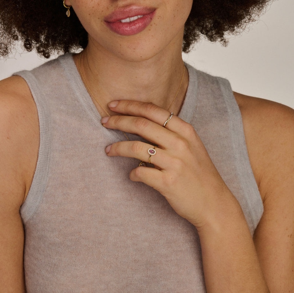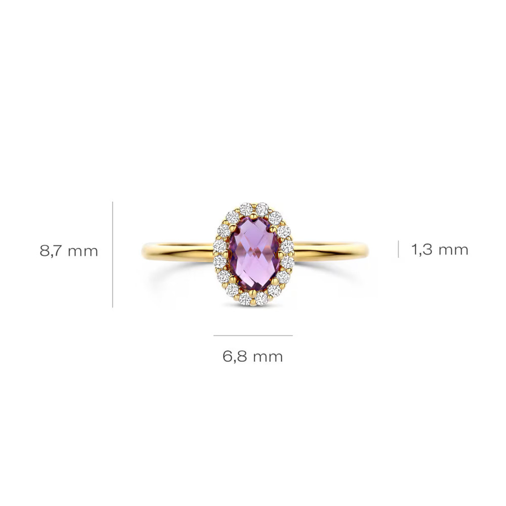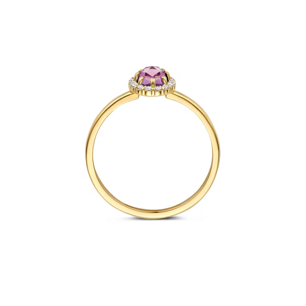 Een twist op een klassiek vormgegeven sieraad: deze 14k geelgouden ring wordt gesierd door paarse Amethist omringd door zirkonia’s in pavé-zetting. De band heeft een doorsnede van 1.3mm en de ring kan mooi gecombineerd worden met ander ringen uit de collectie.