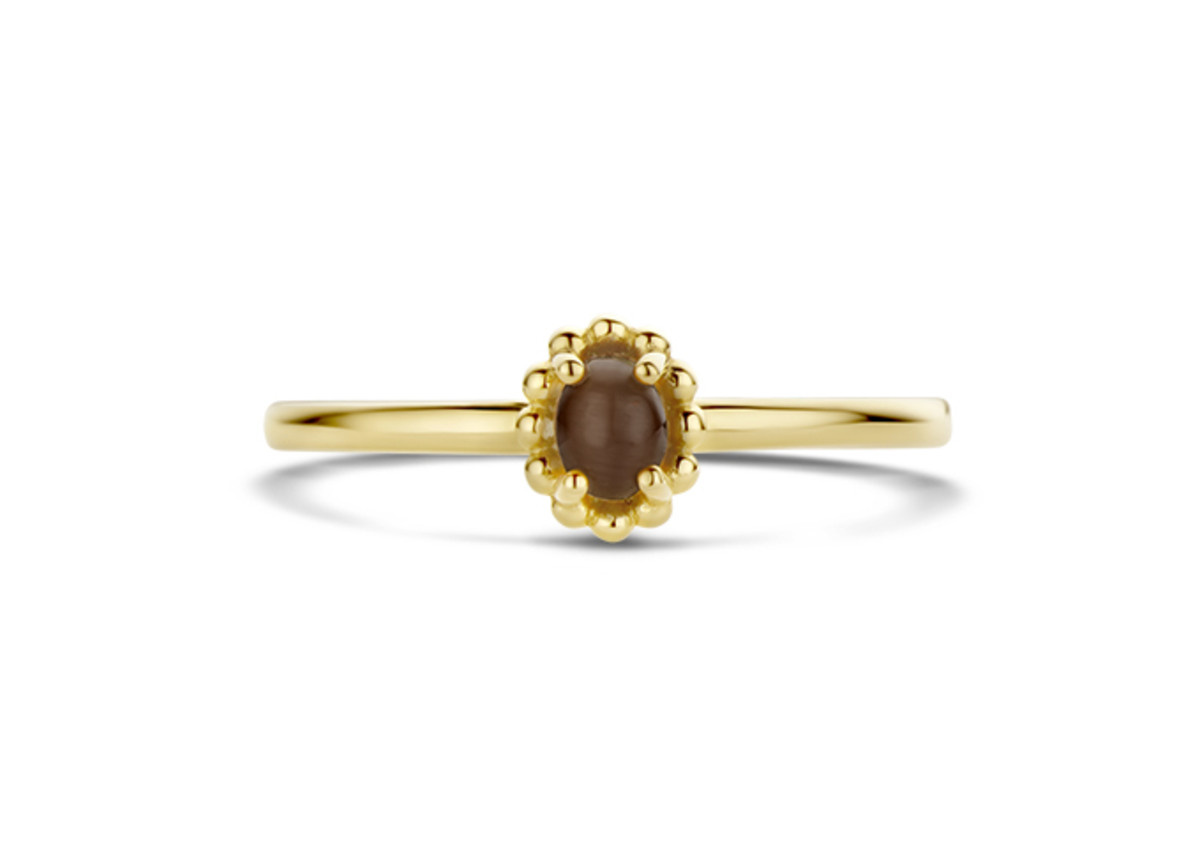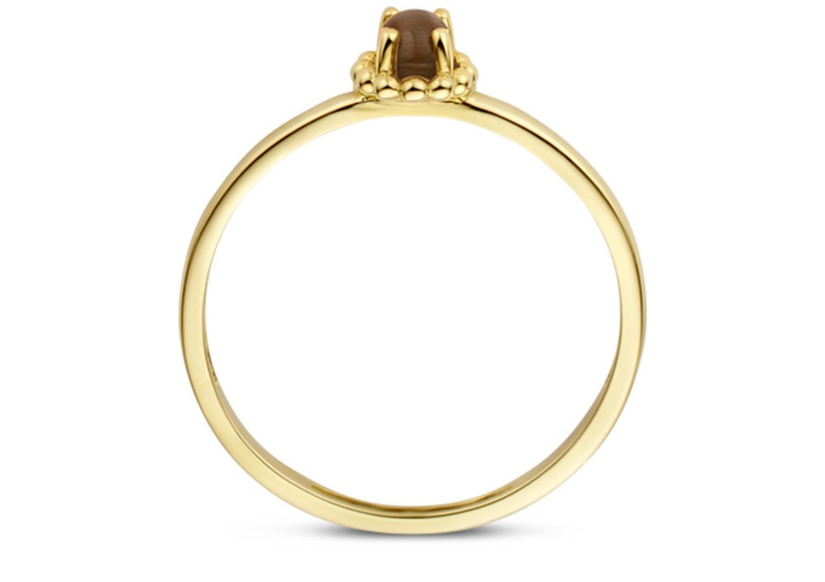 Deze geelgouden ring is verfijnd , subtiel en alledaags draagbaar. Een vrolijke aanschuifring met een bruine Kattenoog.