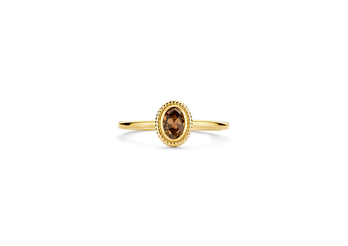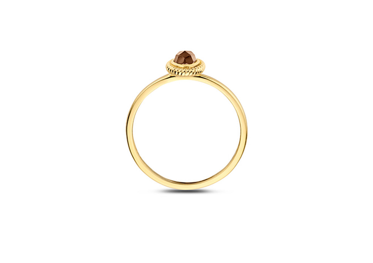 Deze geelgouden ring is tijdloos en elegant. Het Parelmoer met kwarts wordt omringt door een extra gekarteld randje waardoor de ring naast modern ook een vintage tintje krijgt.