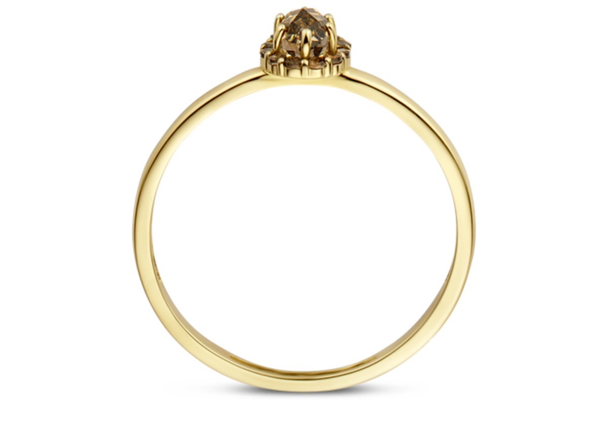 Deze ring van 14k geelgoud met smokey kwarts heeft de wauw-factor door de grotere steen in het midden die wordt omzoomd door kleinere exemplaren. De band van de ring heeft een doorsnede van 1.3 mm. Prachtig op zichzelf maar ook mooi met andere ringen uit onze collectie.