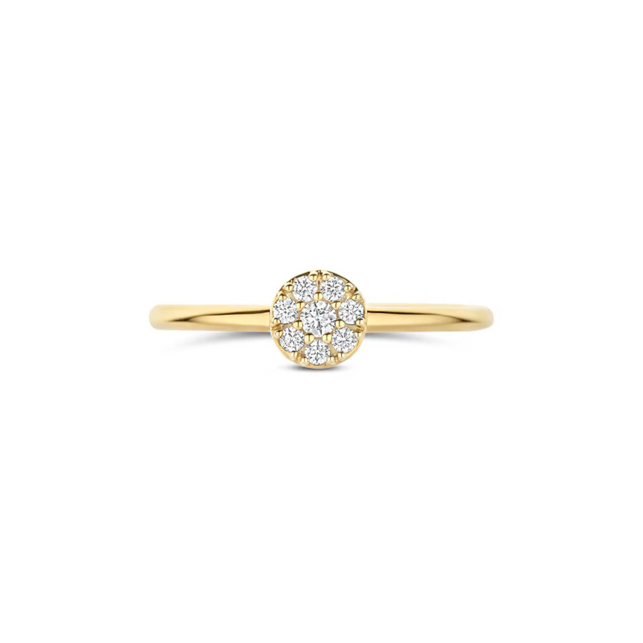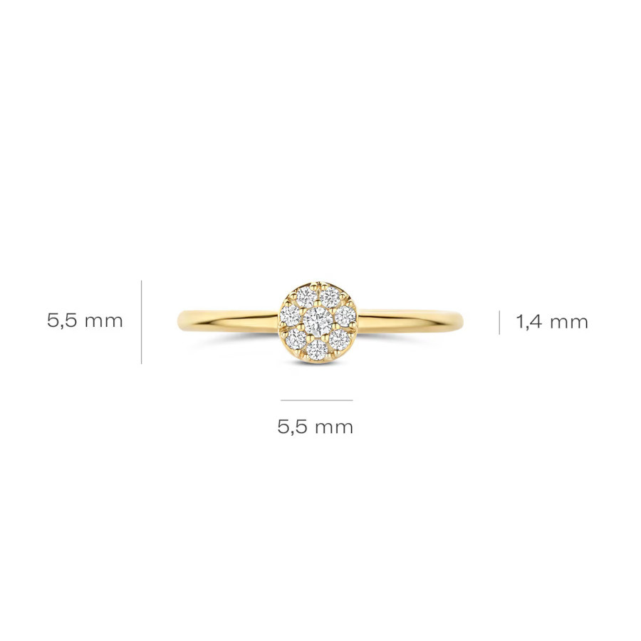 Ontdek deze verfijnde ring, vervaardigd uit 14k geelgoud. Je ziet een slanke band die subtiel overgaat in een cirkelvormig cluster van schitterende zirkonia's. Deze zijn zorgvuldig pavé gezet voor maximale glans. Met een banddikte van 1.4mm draagt hij comfortabel en elegant. Een tijdloze toevoeging aan jouw sieradencollectie. De ring is prachtig solitair te dragen maar perfect om te combineren met andere ringen.