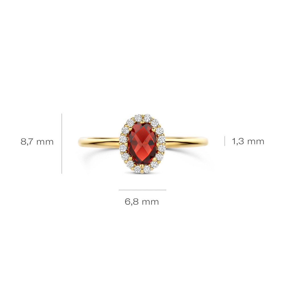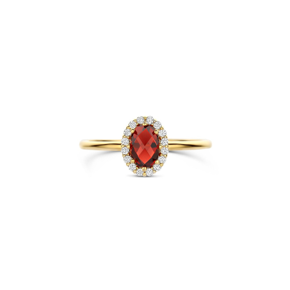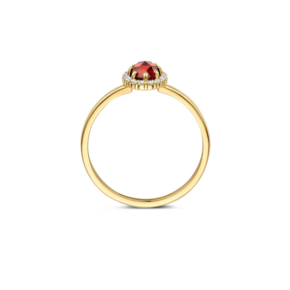 Een twist op een klassiek vormgegeven sieraad: deze 14k geelgouden ring wordt gesierd door mozambique granaat omringd door zirkonia’s in pavé-zetting. De band heeft een doorsnede van 1.3mm en de ring kan mooi gecombineerd worden met ander ringen uit de collectie.