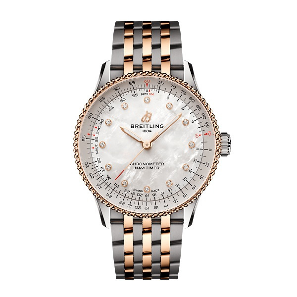 Artikelnummer: U17327211A1U1Breitling’s icon—for the journey. De beroemde Navitimer U17327211A1U1 van Breitling met een frisse witte parelmoer wijzerplaat, voorzien van de kenmerkende Navitimer lunette in 18k roségoud. De horlogeband in staal met 18k roségoud is fijn geschakeld, en alle schakels zijn met de hand gepolijst en gematteerd. De 36mm maat is perfect en verfijnd voor deze klassieke stijl, het horloge is dan ook mooi plat vormgegeven.