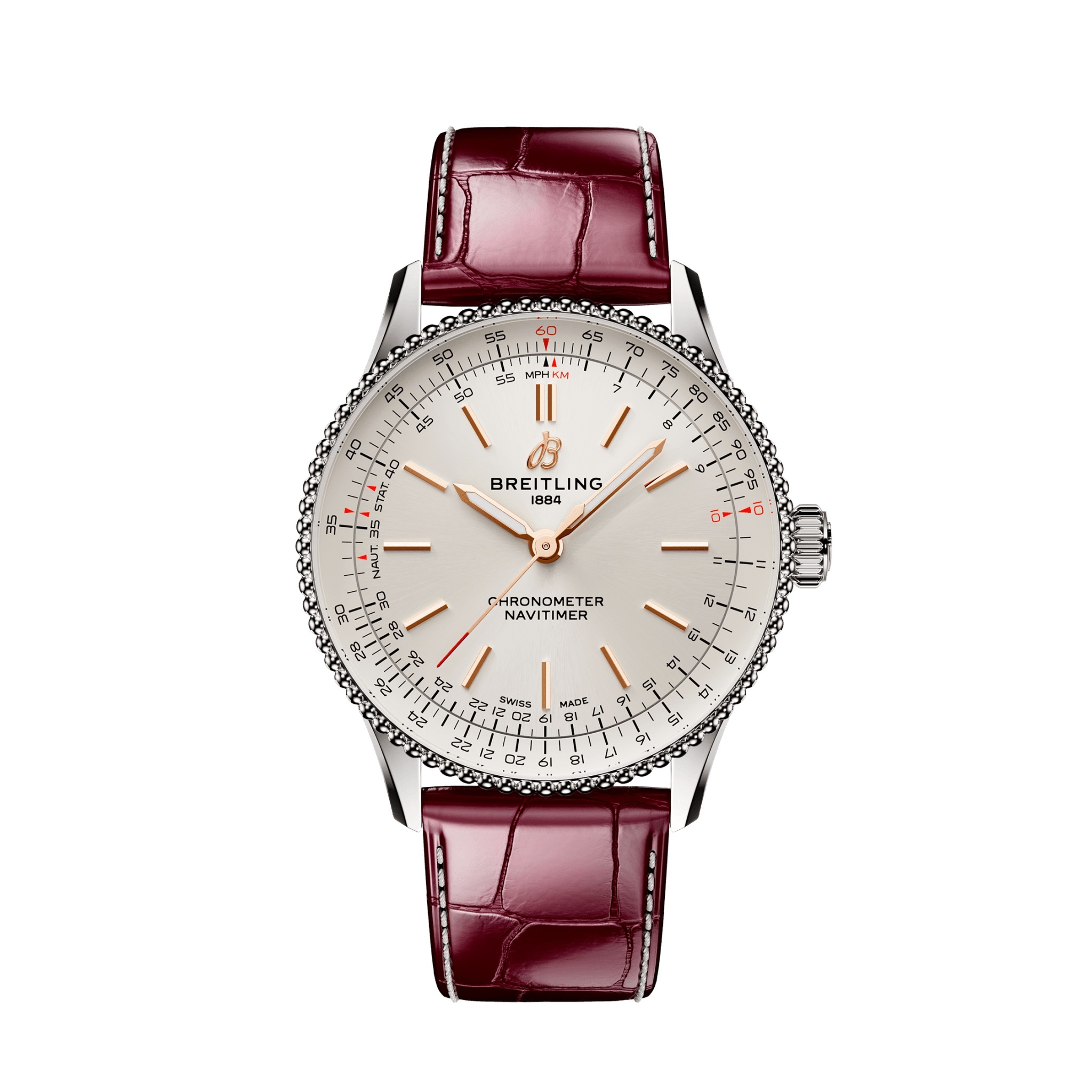 Artikelnummer: A17327211G1P1Breitling’s icon—for the journey. De beroemde Navitimer A17327211G1P1 van Breitling in Met een verzilverde wijzerplaat met warme rosé indexen en wijzers, voorzien van de kenmerkende Navitimer rekenlineaal. De lunette is verfijnd versierd. De lederen band is bordeaux van kleur en voorzien van een vouwsluiting. De 36mm maat is perfect voor deze klassieke stijl, het horloge is dan ook mooi plat vormgegeven.