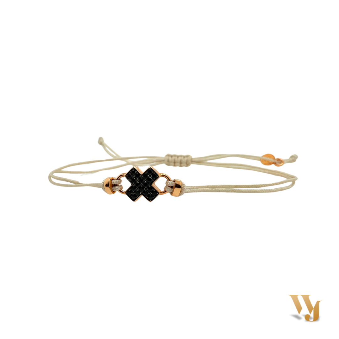 Een vrolijk en speels kusje aan een beige koordje. De voorzijde van het kusje is bezet met zwart Korund en de kleur van de edelsteen zorgt voor een prachtig geheel bij het warme roségoud en kleur van het beige koordje. Een fantastische kleurencombinatie. Prachtig om solitair te dragen maar perfect om te combineren met andere armbanden. Het kusje is net als het balletjesmotief een terugkerend thema in de Bron collectie. Dit model is onderdeel van de 'Joy'-collectie, speciaal gecreëerd om de vrolijke mijlpalen in het leven op te fleuren!